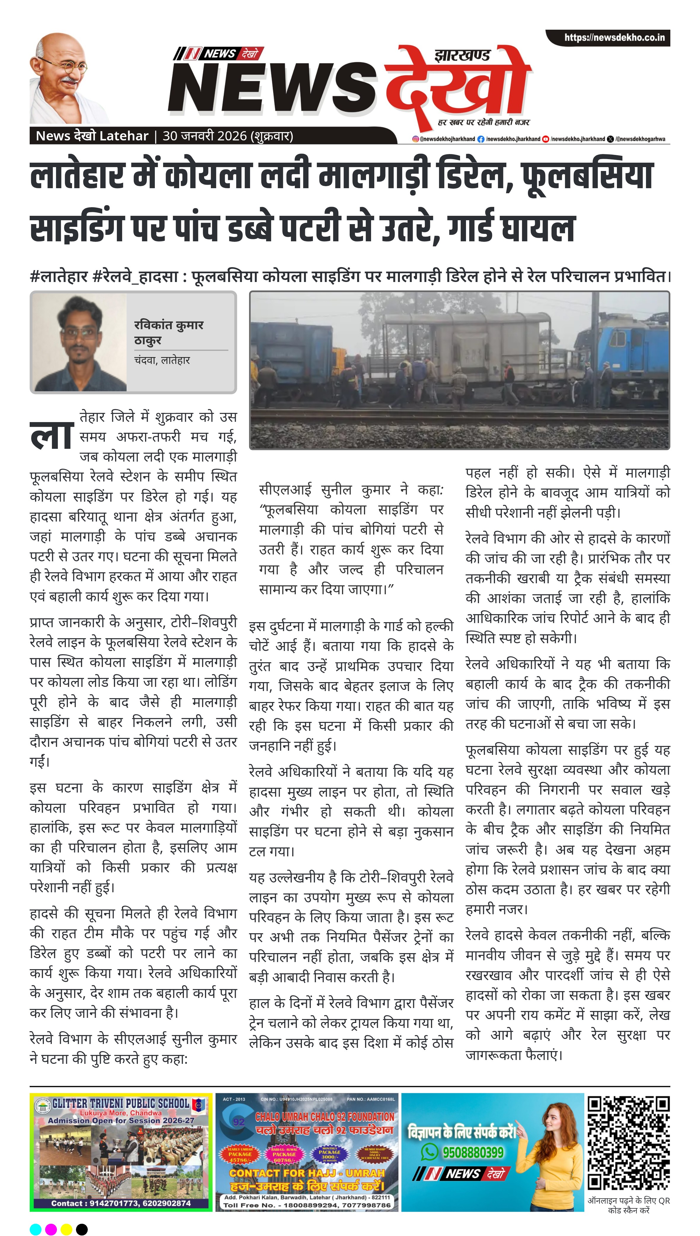 लातेहार जिले में शुक्रवार को उस समय अफरा-तफरी मच गई, जब कोयला लदी एक मालगाड़ी फूलबसिया रेलवे स्टेशन के समीप स्थित कोयला साइडिंग पर डिरेल हो गई। यह हादसा बरियातू थाना क्षेत्र अंतर्गत हुआ, जहां मालगाड़ी के पांच डब्बे अचानक पटरी से उतर गए। घटना की सूचना मिलते ही रेलवे विभाग हरकत में आया और राहत एवं बहाली कार्य शुरू कर दिया गया।