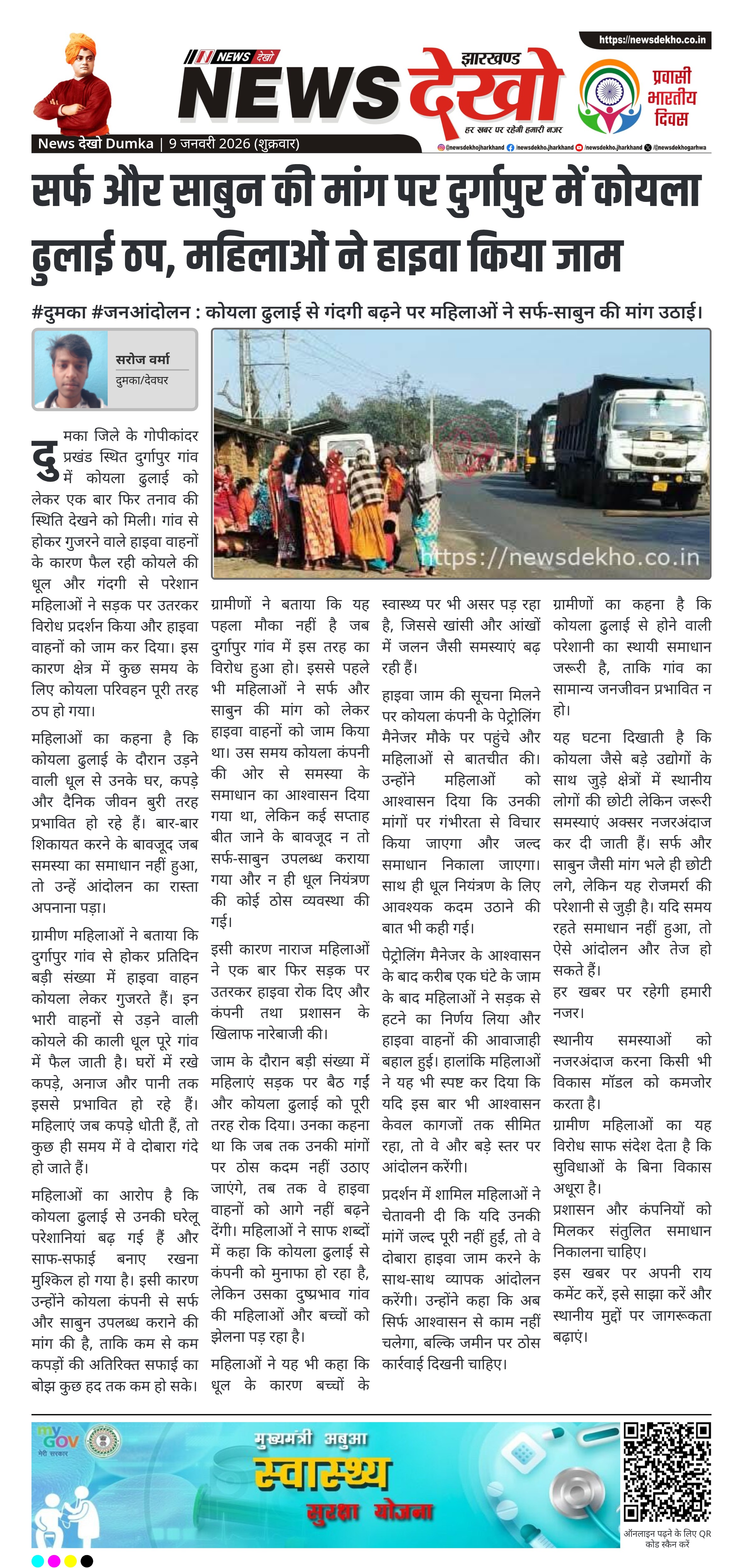 दुमका जिले के गोपीकांदर प्रखंड स्थित दुर्गापुर गांव में कोयला ढुलाई को लेकर एक बार फिर तनाव की स्थिति देखने को मिली। गांव से होकर गुजरने वाले हाइवा वाहनों के कारण फैल रही कोयले की धूल और गंदगी से परेशान महिलाओं ने सड़क पर उतरकर विरोध प्रदर्शन किया और हाइवा वाहनों को जाम कर दिया। इस कारण क्षेत्र में कुछ समय के लिए कोयला परिवहन पूरी तरह ठप हो गया।