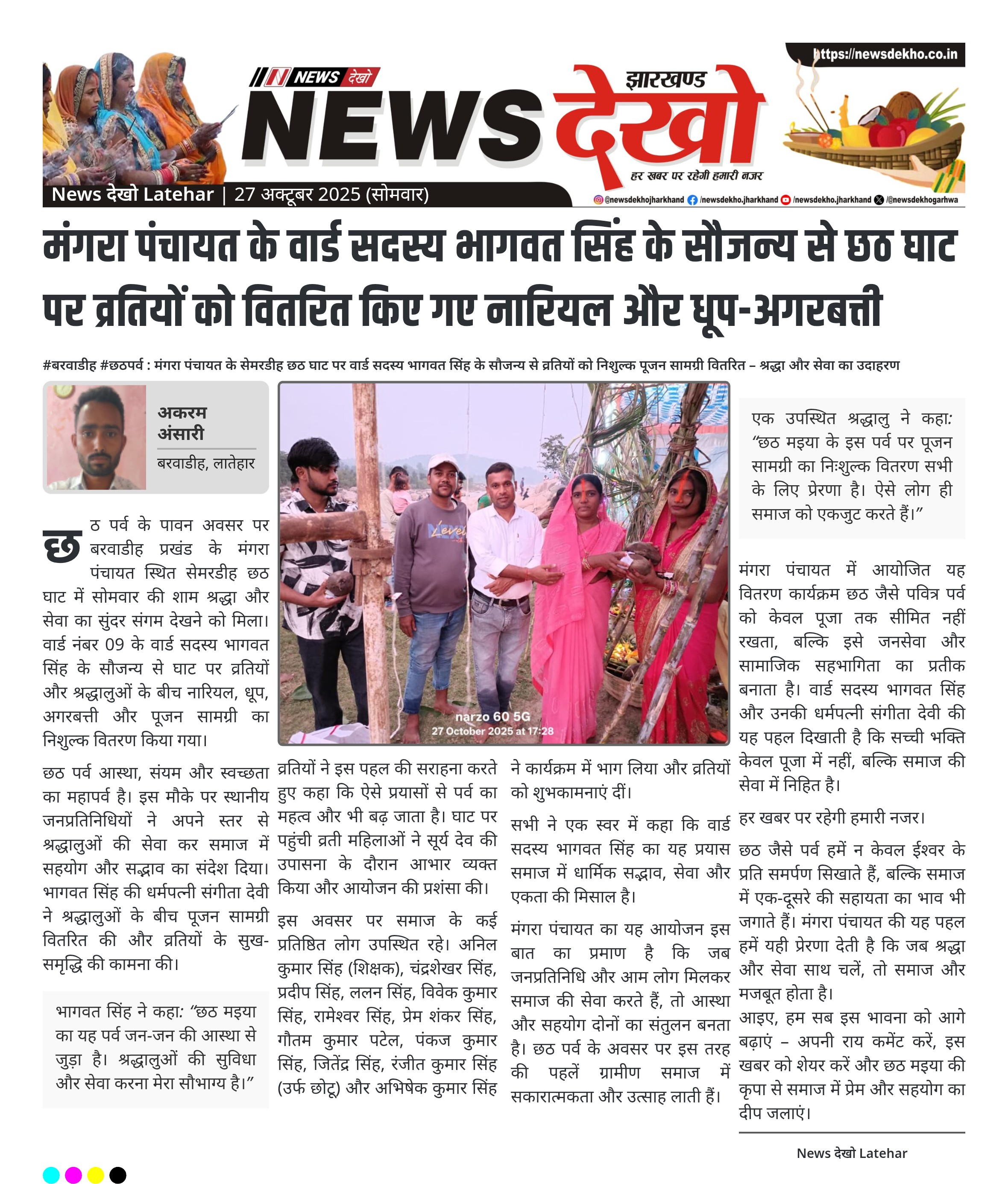 • मंगरा पंचायत वार्ड नंबर 09 में भागवत सिंह के सौजन्य से छठ घाट पर नारियल, धूप और अगरबत्ती का निःशुल्क वितरण किया गया।