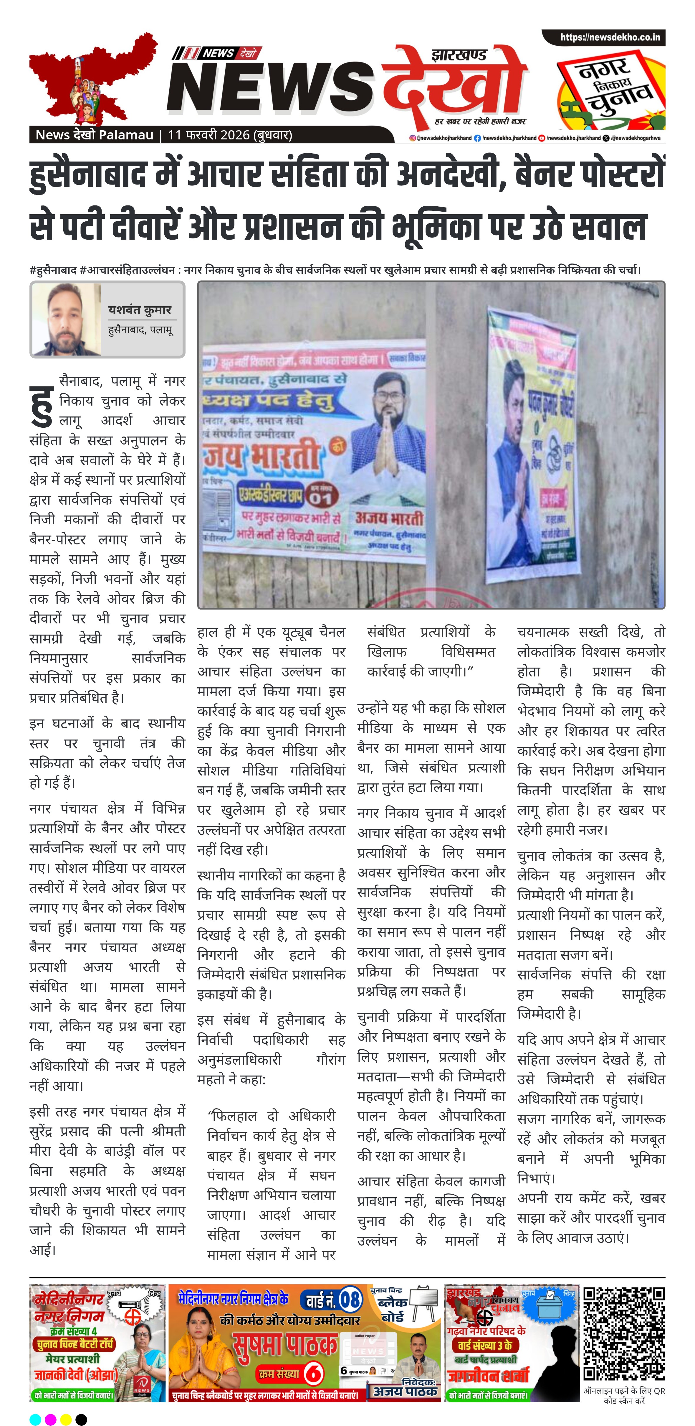 हुसैनाबाद, पलामू में नगर निकाय चुनाव को लेकर लागू आदर्श आचार संहिता के सख्त अनुपालन के दावे अब सवालों के घेरे में हैं। क्षेत्र में कई स्थानों पर प्रत्याशियों द्वारा सार्वजनिक संपत्तियों एवं निजी मकानों की दीवारों पर बैनर-पोस्टर लगाए जाने के मामले सामने आए हैं। मुख्य सड़कों, निजी भवनों और यहां तक कि रेलवे ओवर ब्रिज की दीवारों पर भी चुनाव प्रचार सामग्री देखी गई, जबकि नियमानुसार सार्वजनिक संपत्तियों पर इस प्रकार का प्रचार प्रतिबंधित है।