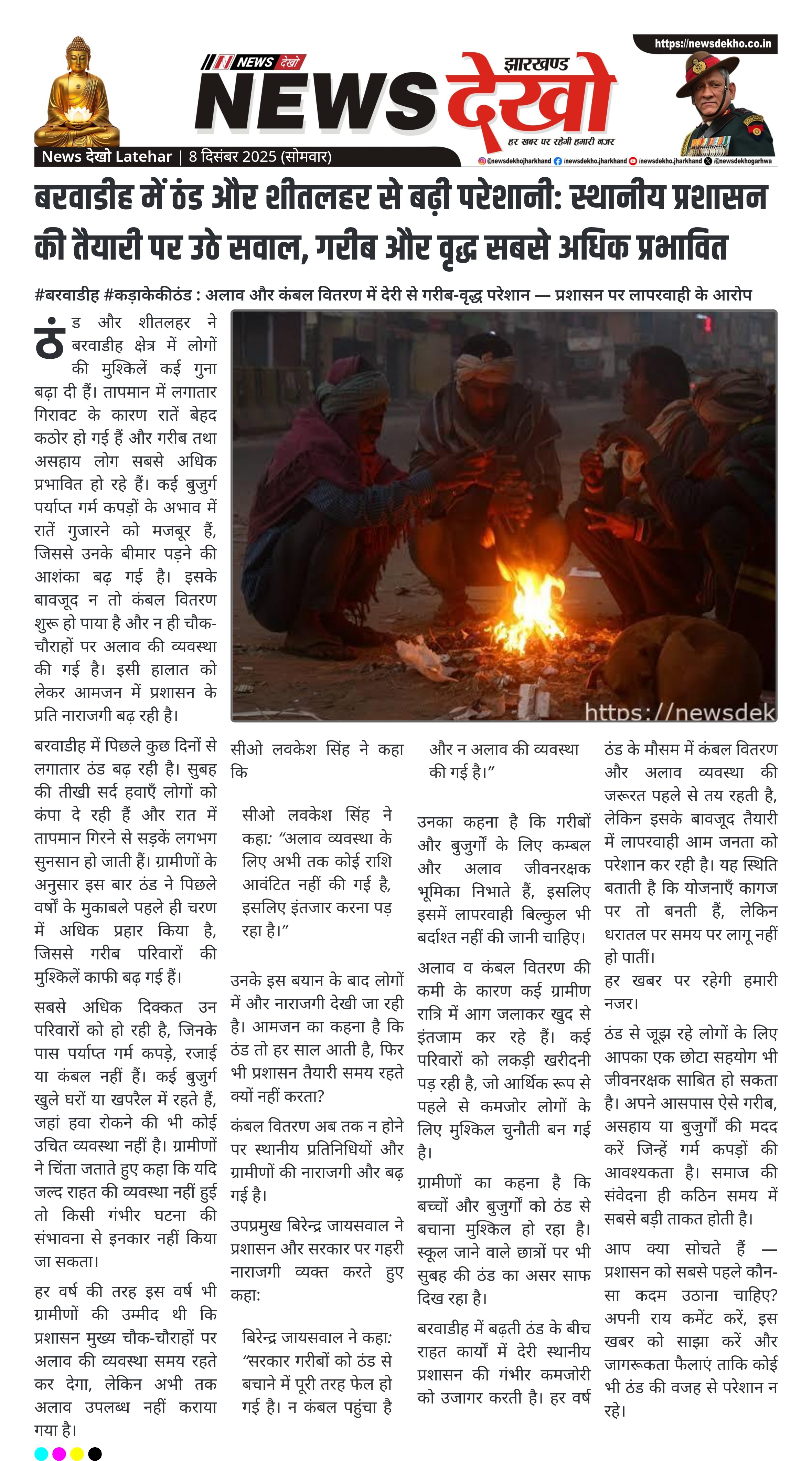 ठंड और शीतलहर ने बरवाडीह क्षेत्र में लोगों की मुश्किलें कई गुना बढ़ा दी हैं। तापमान में लगातार गिरावट के कारण रातें बेहद कठोर हो गई हैं और गरीब तथा असहाय लोग सबसे अधिक प्रभावित हो रहे हैं। कई बुजुर्ग पर्याप्त गर्म कपड़ों के अभाव में रातें गुजारने को मजबूर हैं, जिससे उनके बीमार पड़ने की आशंका बढ़ गई है। इसके बावजूद न तो कंबल वितरण शुरू हो पाया है और न ही चौक-चौराहों पर अलाव की व्यवस्था की गई है। इसी हालात को लेकर आमजन में प्रशासन के प्रति नाराजगी बढ़ रही है।