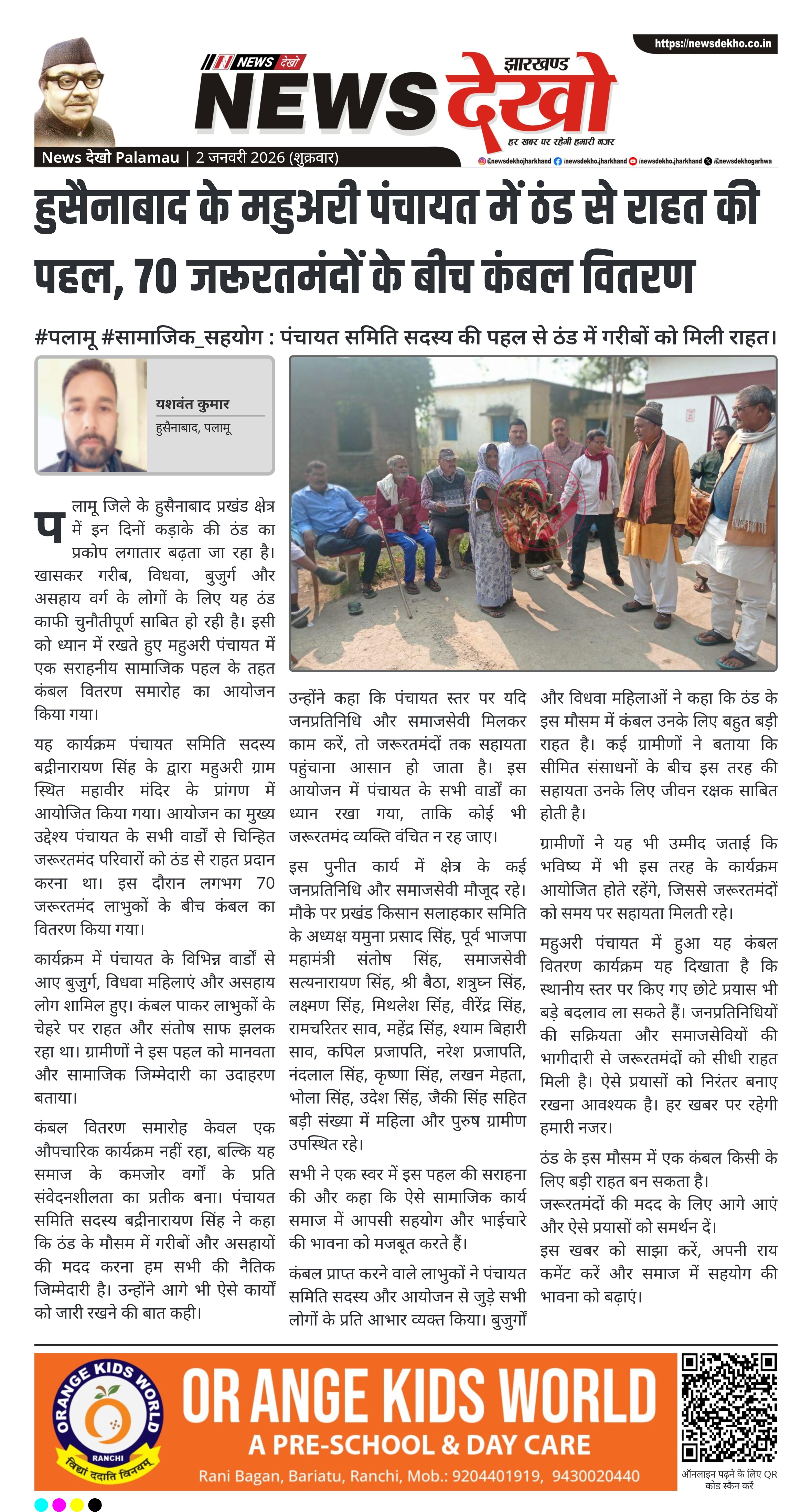 पलामू जिले के हुसैनाबाद प्रखंड क्षेत्र में इन दिनों कड़ाके की ठंड का प्रकोप लगातार बढ़ता जा रहा है। खासकर गरीब, विधवा, बुजुर्ग और असहाय वर्ग के लोगों के लिए यह ठंड काफी चुनौतीपूर्ण साबित हो रही है। इसी को ध्यान में रखते हुए महुअरी पंचायत में एक सराहनीय सामाजिक पहल के तहत कंबल वितरण समारोह का आयोजन किया गया।