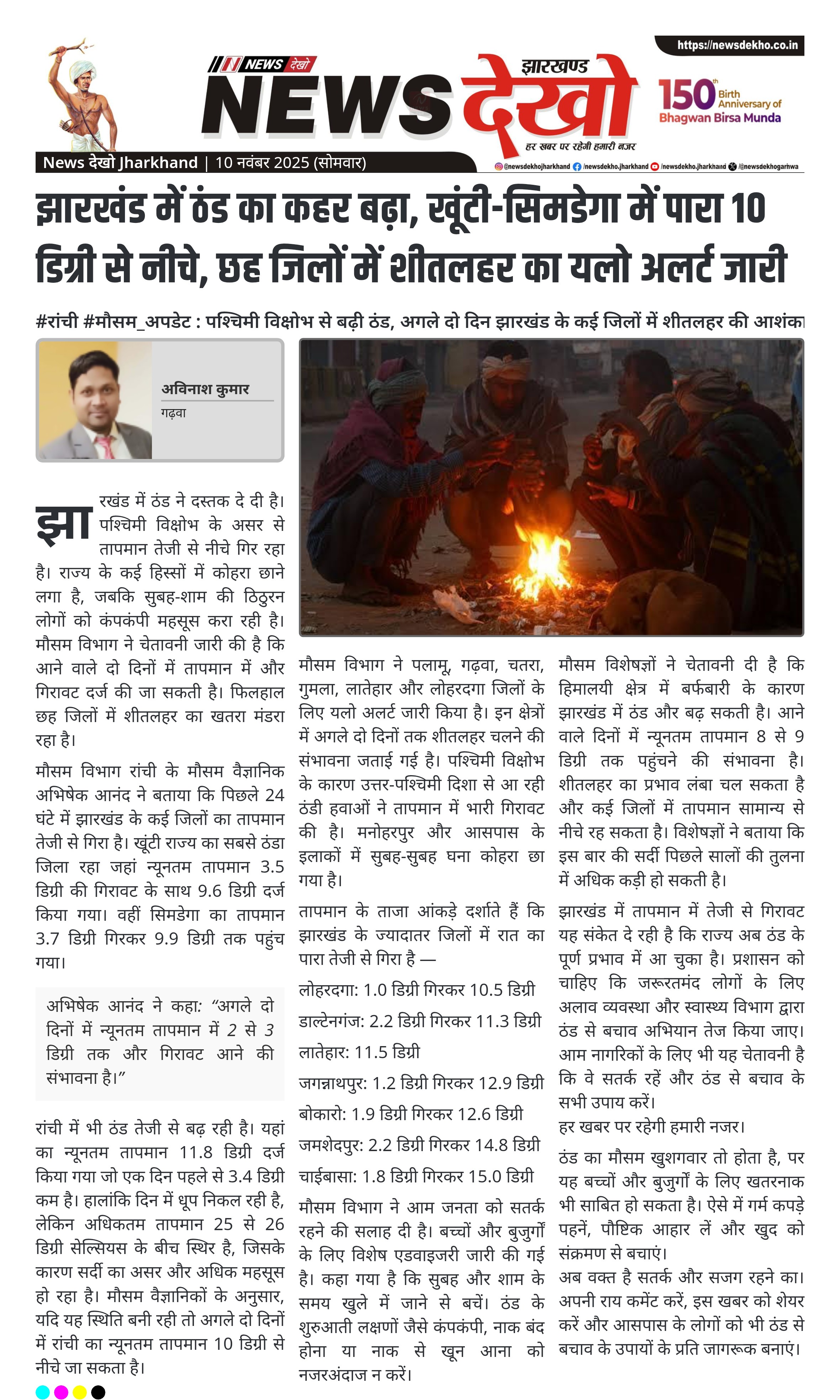• खूंटी का न्यूनतम तापमान 9.6 डिग्री, सिमडेगा में 9.9 डिग्री दर्ज किया गया।