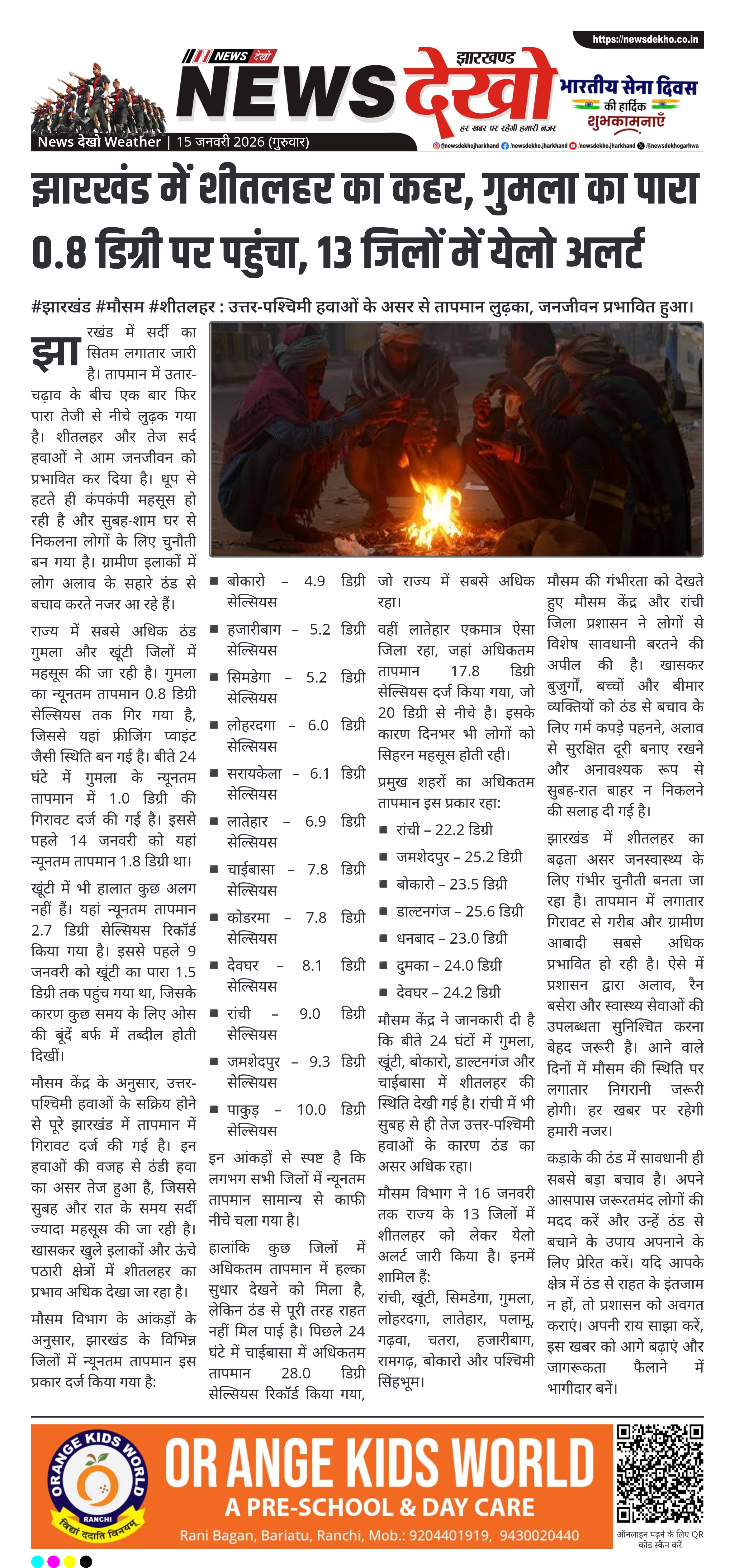 - गुमला में न्यूनतम तापमान 0.8 डिग्री सेल्सियस दर्ज।
