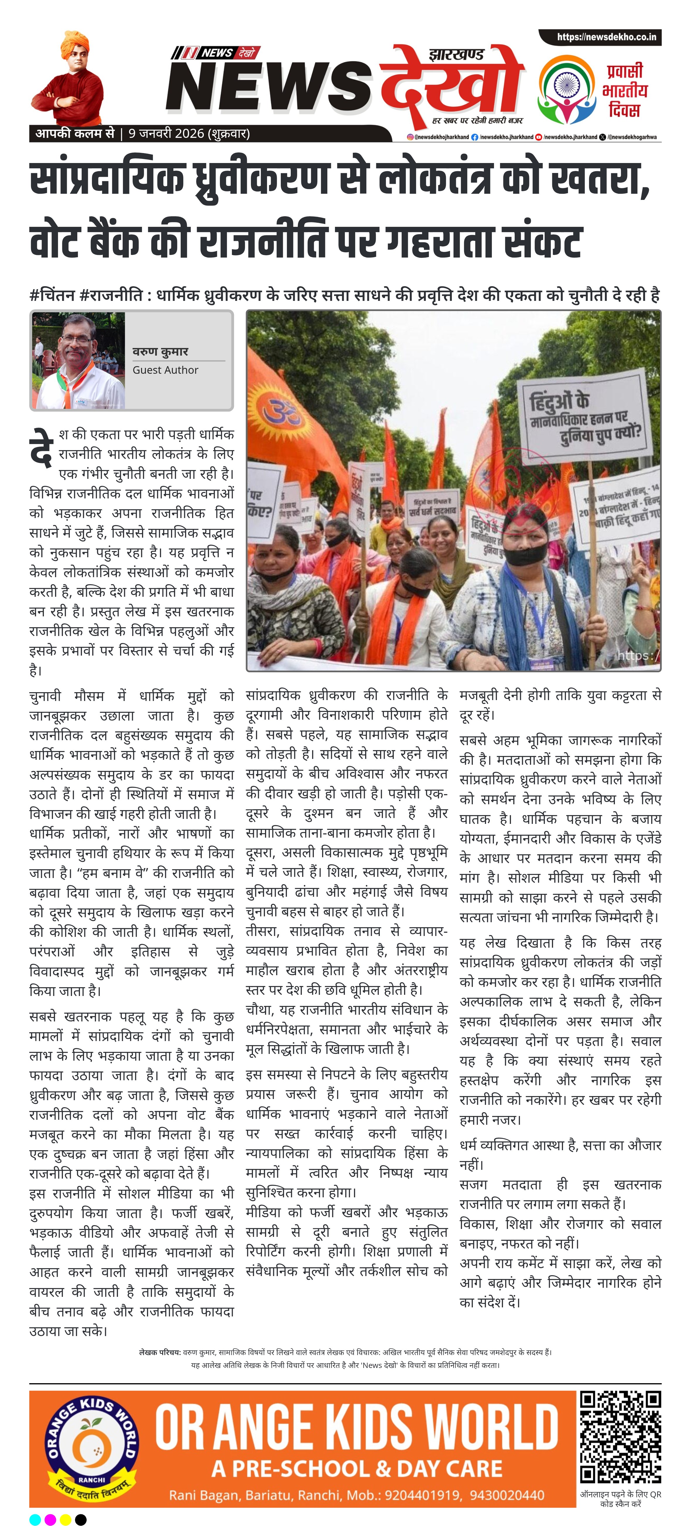 भारतीय लोकतंत्र में सांप्रदायिक ध्रुवीकरण आधारित राजनीति लगातार मजबूत होती जा रही है, जिससे सामाजिक सद्भाव और संवैधानिक मूल्यों पर गंभीर प्रश्न खड़े हो रहे हैं। चुनावी लाभ के लिए धार्मिक भावनाओं के इस्तेमाल को लेकर देशभर में चिंता बढ़ी है। यह प्रवृत्ति न केवल विकासात्मक मुद्दों को पीछे धकेल रही है, बल्कि हिंसा, अविश्वास और आर्थिक नुकसान का कारण भी बन रही है। विशेषज्ञ मानते हैं कि इससे निपटने के लिए संस्थागत सख्ती और नागरिक जागरूकता दोनों जरूरी हैं।