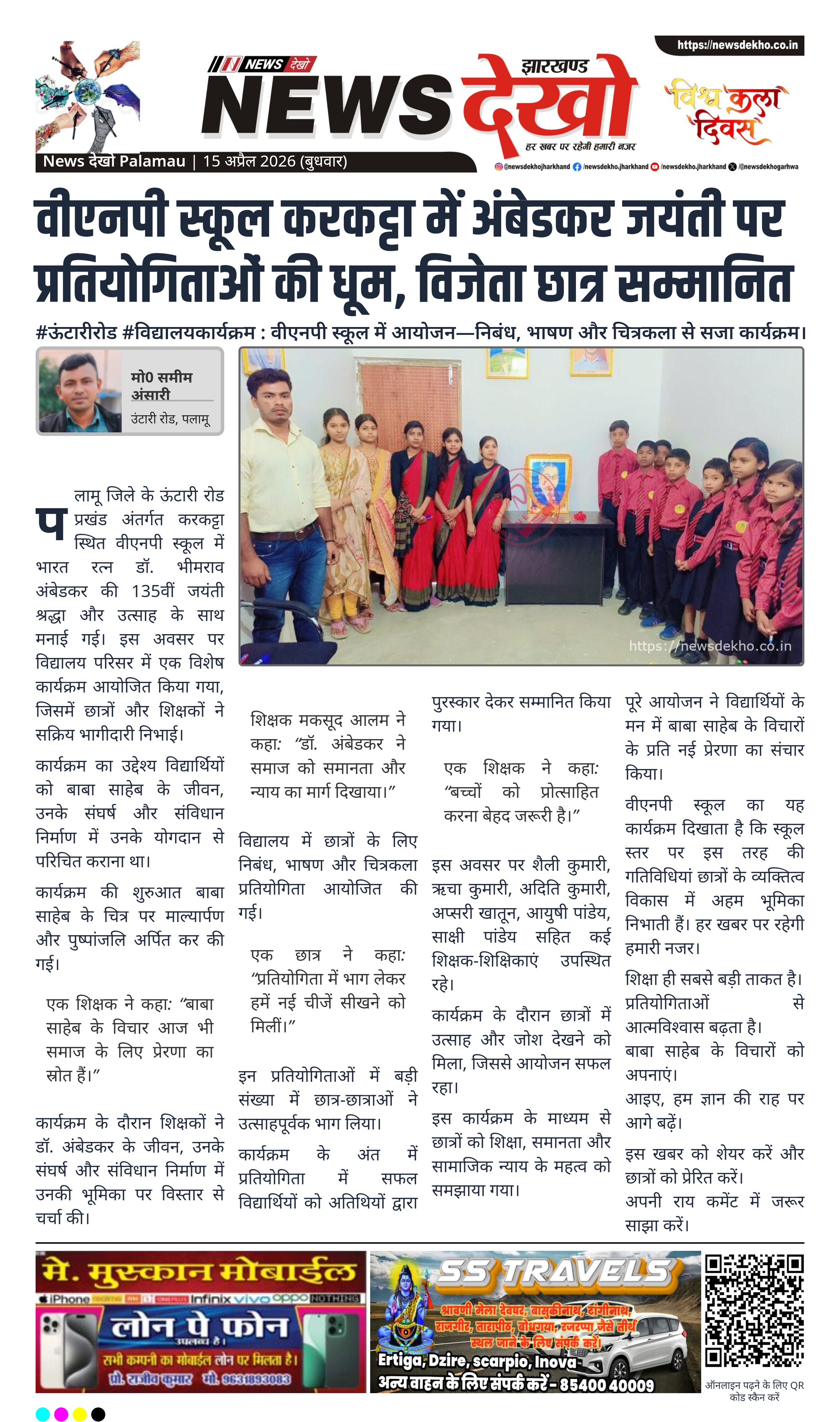 पलामू के ऊंटारी रोड स्थित वीएनपी स्कूल में अंबेडकर जयंती पर कार्यक्रम आयोजित हुआ। छात्रों के लिए निबंध, भाषण और चित्रकला प्रतियोगिता कराई गई। शिक्षकों ने बाबा साहेब के विचारों पर प्रकाश डाला। विजेता छात्रों को सम्मानित किया गया।