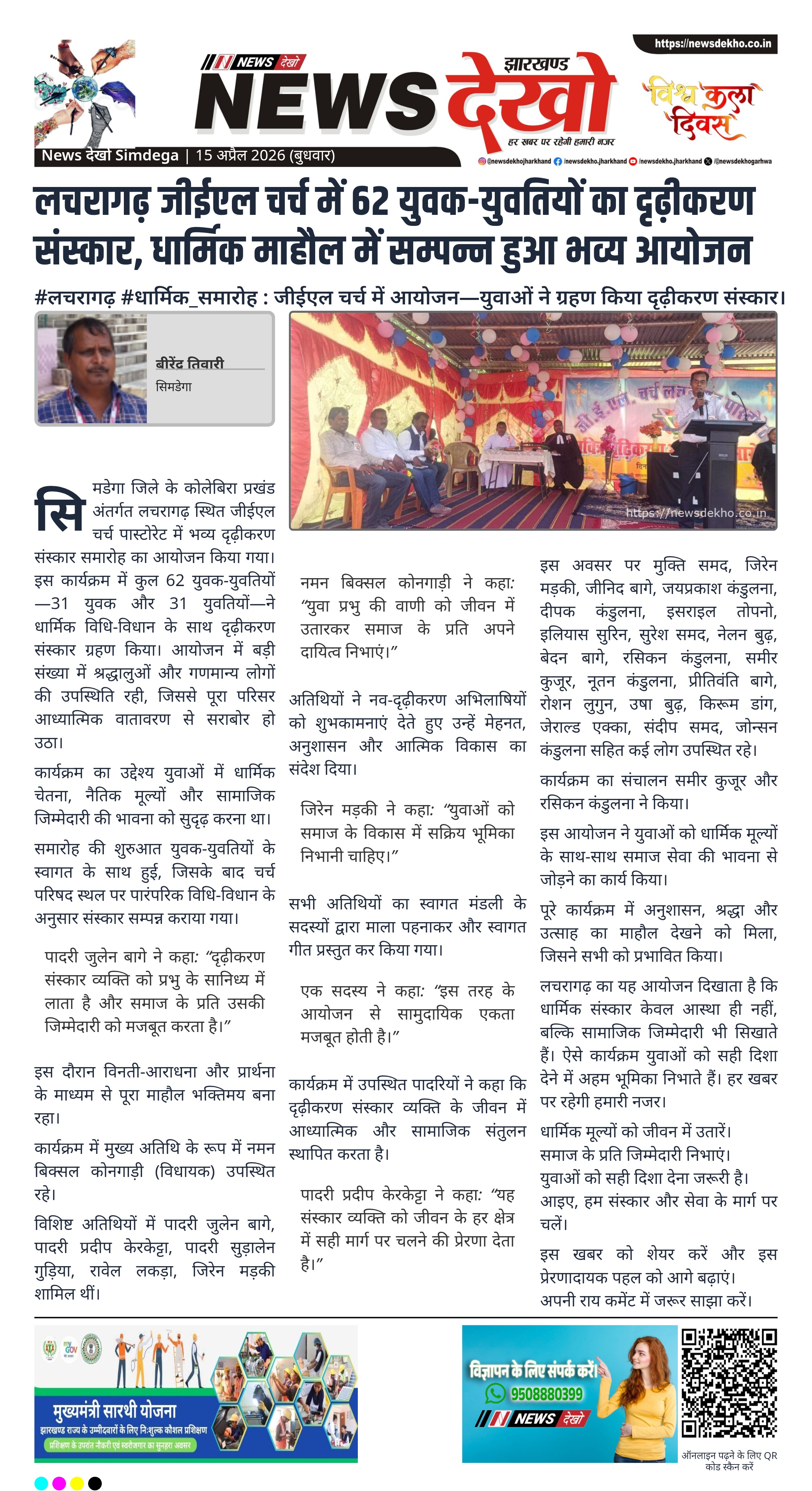 सिमडेगा के लचरागढ़ स्थित जीईएल चर्च में 62 युवक-युवतियों का दृढ़ीकरण संस्कार सम्पन्न हुआ। कार्यक्रम में विधायक नमन बिक्सल कोनगाड़ी समेत कई अतिथि शामिल हुए। धार्मिक विधि-विधान के साथ संस्कार कराया गया। युवाओं को जीवन में अनुशासन और सेवा का संदेश दिया गया।