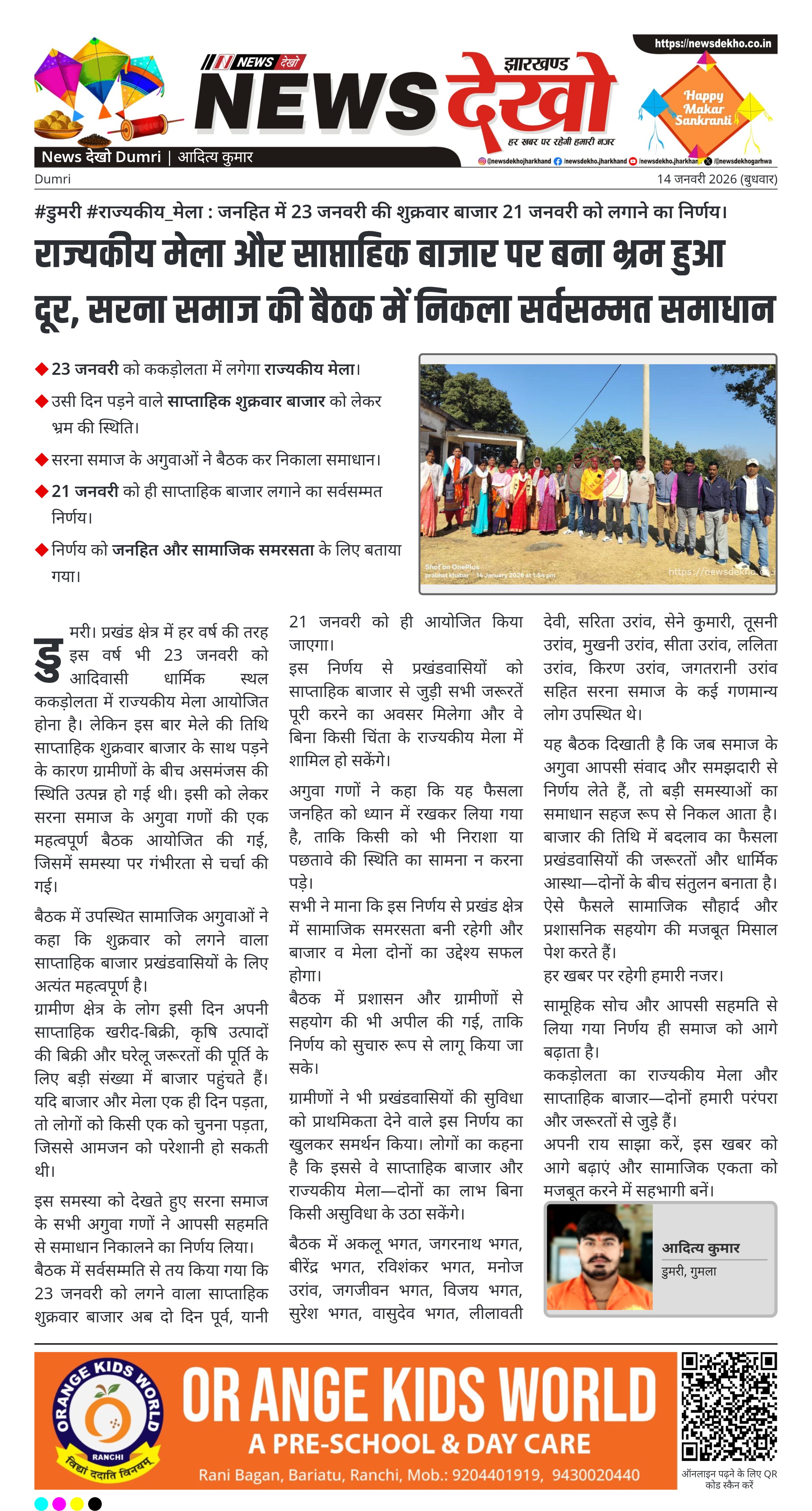 डुमरी प्रखंड में 23 जनवरी को ककड़ोलता में आयोजित होने वाले राज्यकीय मेला और उसी दिन पड़ने वाले साप्ताहिक शुक्रवार बाजार को लेकर उत्पन्न भ्रम को दूर करने के लिए सरना समाज के अगुवा गणों की एक महत्वपूर्ण बैठक आयोजित की गई। बैठक का उद्देश्य प्रखंडवासियों को किसी असुविधा से बचाना और बाजार व मेला दोनों में सहभागिता का मार्ग प्रशस्त करना था। विचार-विमर्श के बाद सर्वसम्मति से बाजार की तिथि में बदलाव का निर्णय लिया गया, जिससे आमजन को राहत मिलने की उम्मीद है।