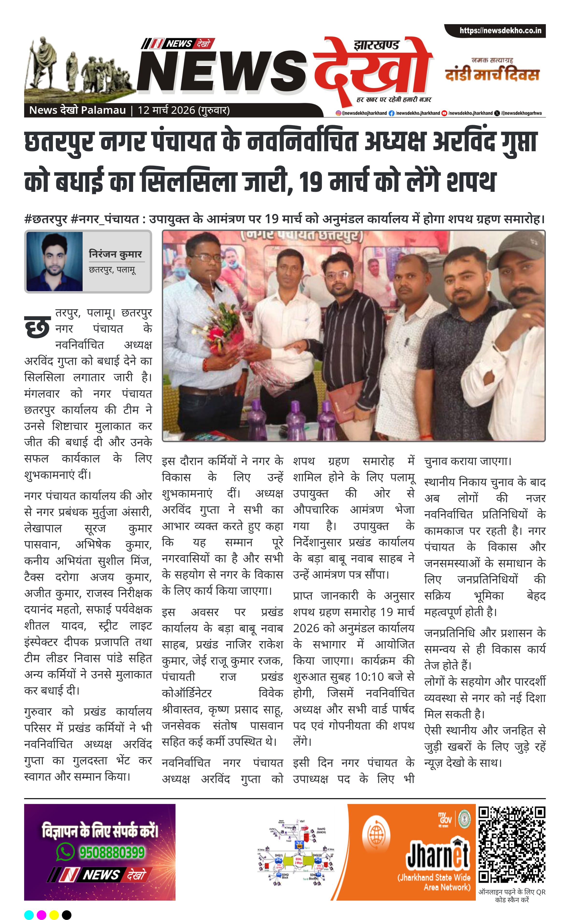 पलामू जिले के छतरपुर नगर पंचायत के नवनिर्वाचित अध्यक्ष अरविंद गुप्ता को बधाई देने का सिलसिला लगातार जारी है। नगर पंचायत कार्यालय और प्रखंड कार्यालय के कर्मियों ने उनसे मुलाकात कर जीत की शुभकामनाएं दीं। वहीं उपायुक्त की ओर से 19 मार्च को होने वाले शपथ ग्रहण समारोह के लिए उन्हें औपचारिक आमंत्रण भी दिया गया है।