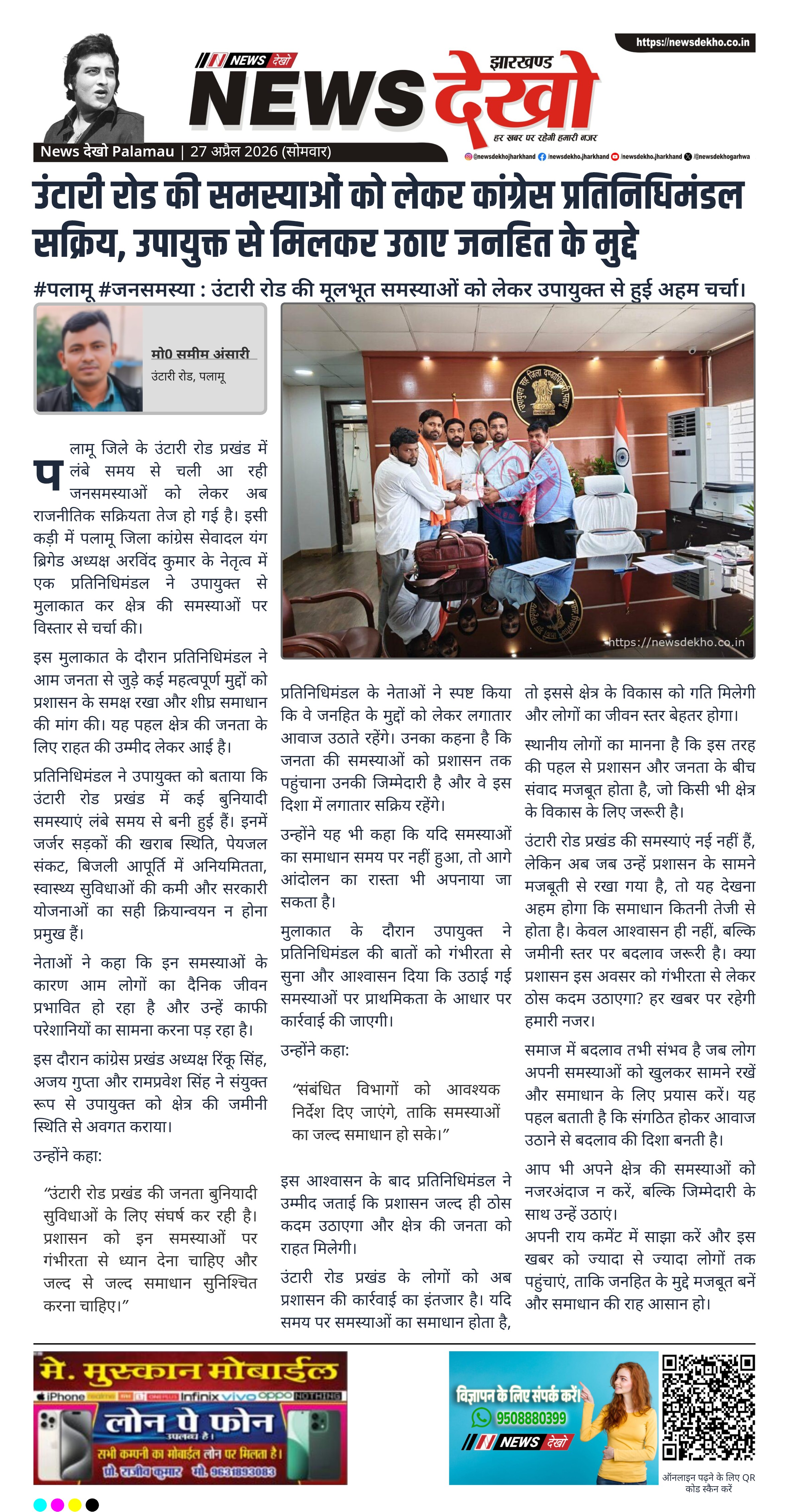 पलामू जिले के उंटारी रोड प्रखंड की विभिन्न जनसमस्याओं को लेकर कांग्रेस सेवादल यंग ब्रिगेड के नेतृत्व में प्रतिनिधिमंडल ने उपायुक्त से मुलाकात की। इस दौरान सड़क, पानी, बिजली और स्वास्थ्य जैसी बुनियादी समस्याओं को प्रमुखता से उठाया गया। प्रशासन को इन समस्याओं से अवगत कराते हुए जल्द समाधान की मांग की गई। उपायुक्त ने भी प्राथमिकता के आधार पर कार्रवाई का आश्वासन दिया है।