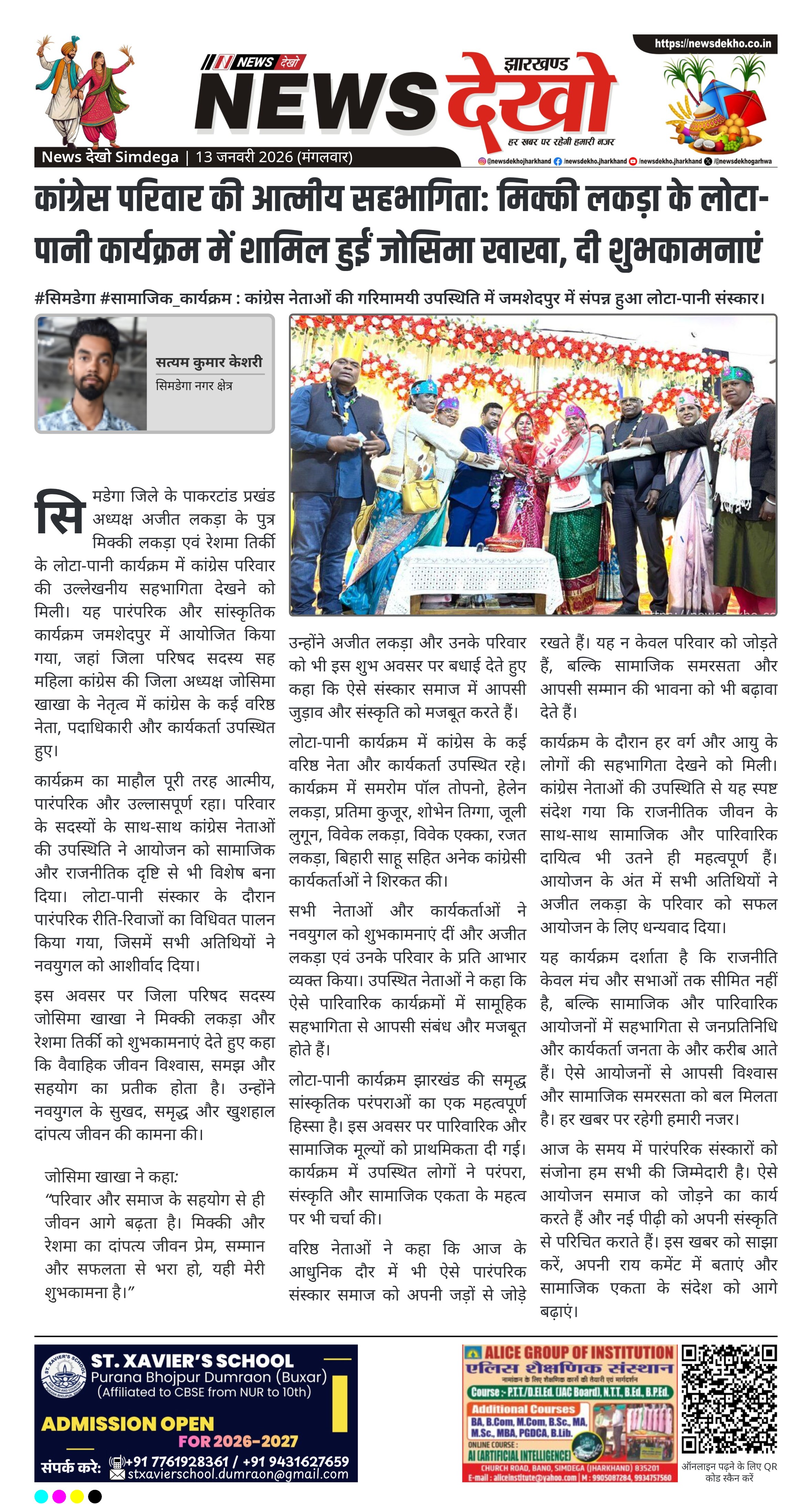 सिमडेगा जिले की जिला परिषद सदस्य एवं महिला कांग्रेस की जिला अध्यक्ष जोसिमा खाखा कांग्रेस पदाधिकारियों के साथ पाकरटांड प्रखंड अध्यक्ष अजीत लकड़ा के पुत्र मिक्की लकड़ा के लोटा-पानी कार्यक्रम में शामिल हुईं। यह पारंपरिक कार्यक्रम जमशेदपुर में आयोजित किया गया, जहां कांग्रेस परिवार की सामूहिक उपस्थिति ने आयोजन को विशेष बना दिया। नेताओं ने नवयुगल मिक्की लकड़ा और रेशमा तिर्की को आशीर्वाद देते हुए सुखद दांपत्य जीवन की कामना की। कार्यक्रम सामाजिक सौहार्द और पारिवारिक आत्मीयता का प्रतीक बना।