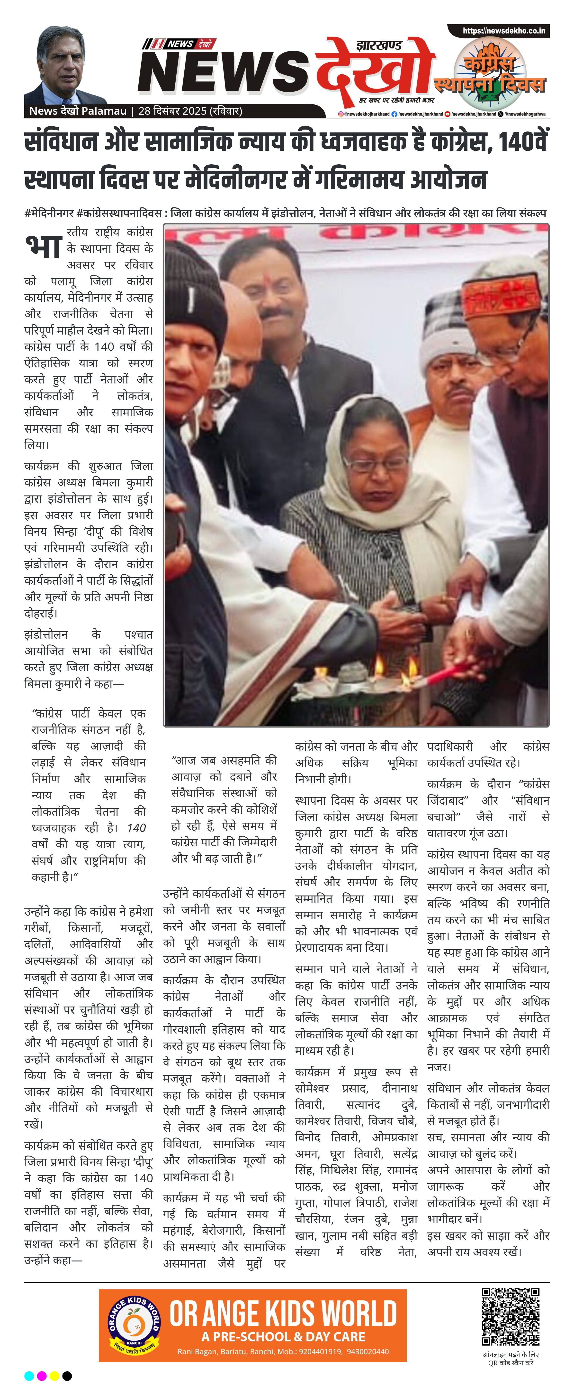 भारतीय राष्ट्रीय कांग्रेस के 140वें स्थापना दिवस के अवसर पर मेदिनीनगर स्थित जिला कांग्रेस कार्यालय में गरिमामय वातावरण में झंडोत्तोलन कार्यक्रम आयोजित किया गया। जिला कांग्रेस अध्यक्ष बिमला कुमारी द्वारा ध्वजारोहण किया गया। कार्यक्रम में कांग्रेस के गौरवशाली इतिहास, लोकतांत्रिक संघर्ष और सामाजिक न्याय के प्रति प्रतिबद्धता को दोहराया गया।