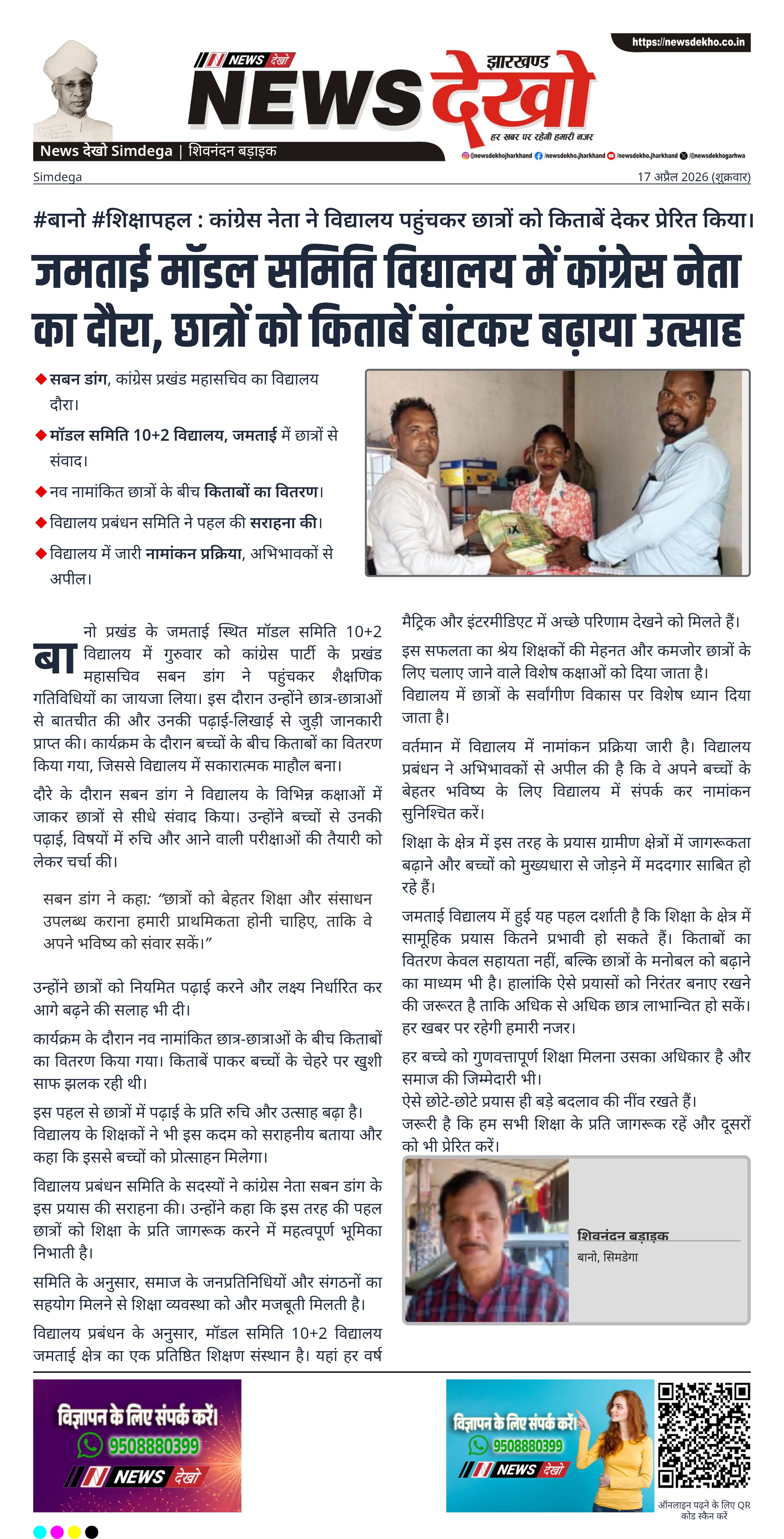 बानो प्रखंड के जमताई स्थित मॉडल समिति 10+2 विद्यालय में गुरुवार को कांग्रेस पार्टी के प्रखंड महासचिव सबन डांग ने पहुंचकर शैक्षणिक गतिविधियों का जायजा लिया। इस दौरान उन्होंने छात्र-छात्राओं से बातचीत की और उनकी पढ़ाई-लिखाई से जुड़ी जानकारी प्राप्त की। कार्यक्रम के दौरान बच्चों के बीच किताबों का वितरण किया गया, जिससे विद्यालय में सकारात्मक माहौल बना।
