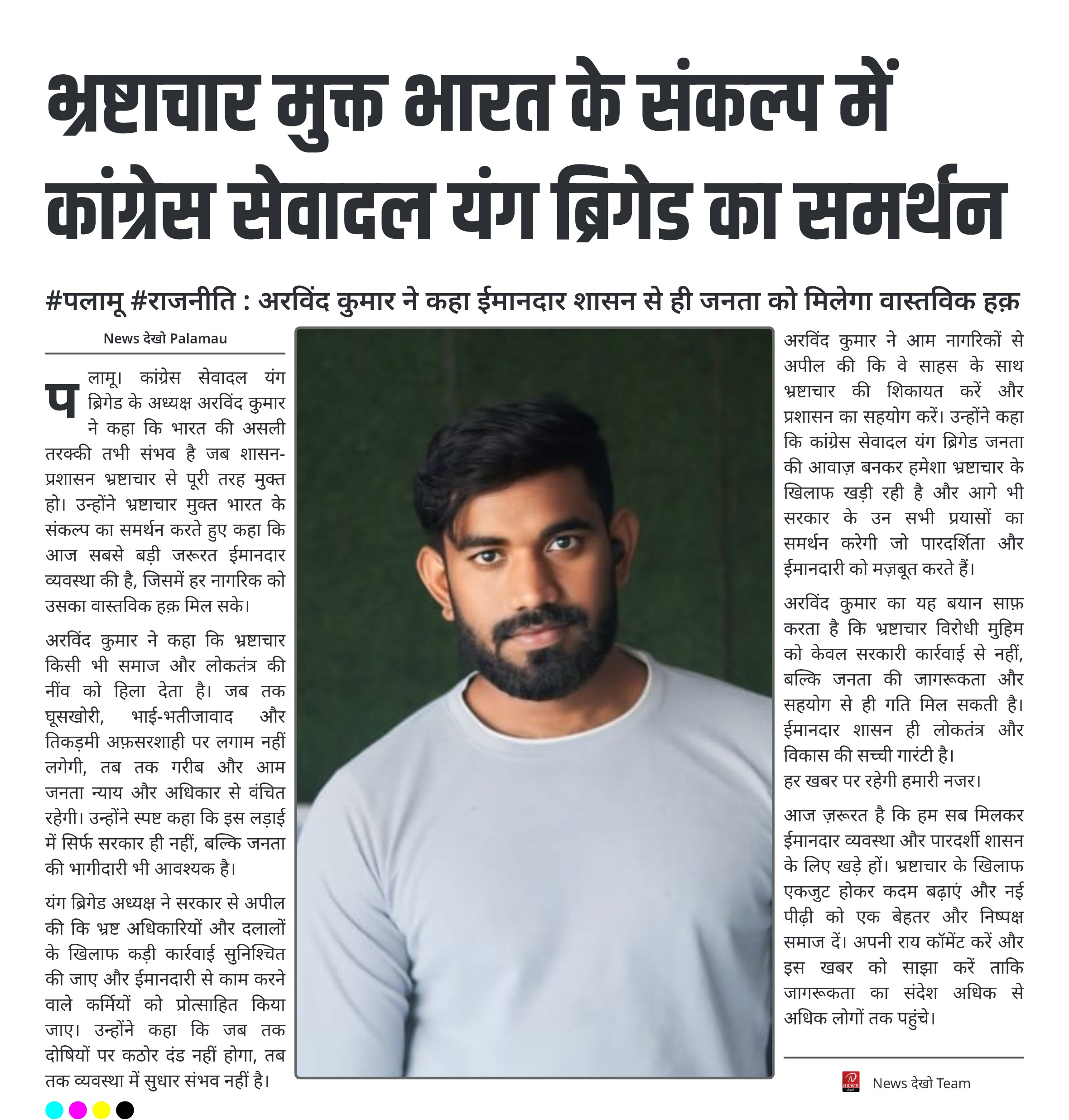 अरविंद कुमार ने आम नागरिकों से अपील की कि वे साहस के साथ भ्रष्टाचार की शिकायत करें और प्रशासन का सहयोग करें। उन्होंने कहा कि कांग्रेस सेवादल यंग ब्रिगेड जनता की आवाज़ बनकर हमेशा भ्रष्टाचार के खिलाफ खड़ी रही है और आगे भी सरकार के उन सभी प्रयासों का समर्थन करेगी जो पारदर्शिता और ईमानदारी को मज़बूत करते हैं।