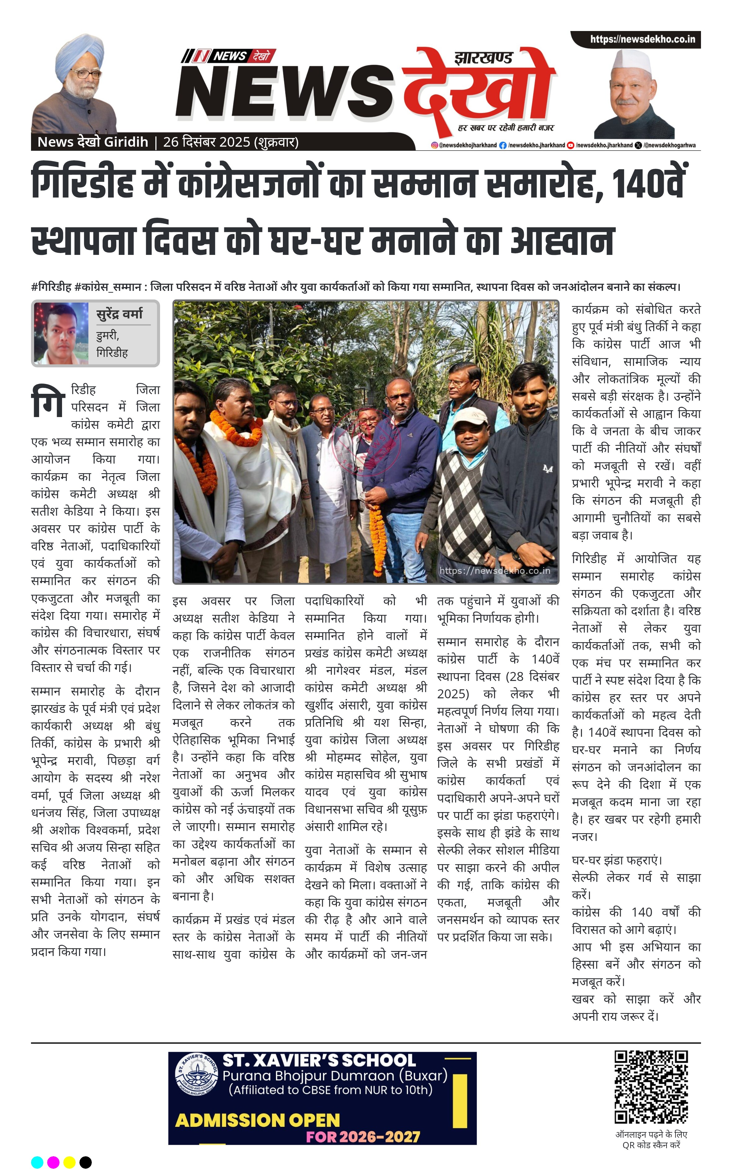 गिरिडीह में आयोजित यह सम्मान समारोह कांग्रेस संगठन की एकजुटता और सक्रियता को दर्शाता है। वरिष्ठ नेताओं से लेकर युवा कार्यकर्ताओं तक, सभी को एक मंच पर सम्मानित कर पार्टी ने स्पष्ट संदेश दिया है कि कांग्रेस हर स्तर पर अपने कार्यकर्ताओं को महत्व देती है। 140वें स्थापना दिवस को घर-घर मनाने का निर्णय संगठन को जनआंदोलन का रूप देने की दिशा में एक मजबूत कदम माना जा रहा है। हर खबर पर रहेगी हमारी नजर।