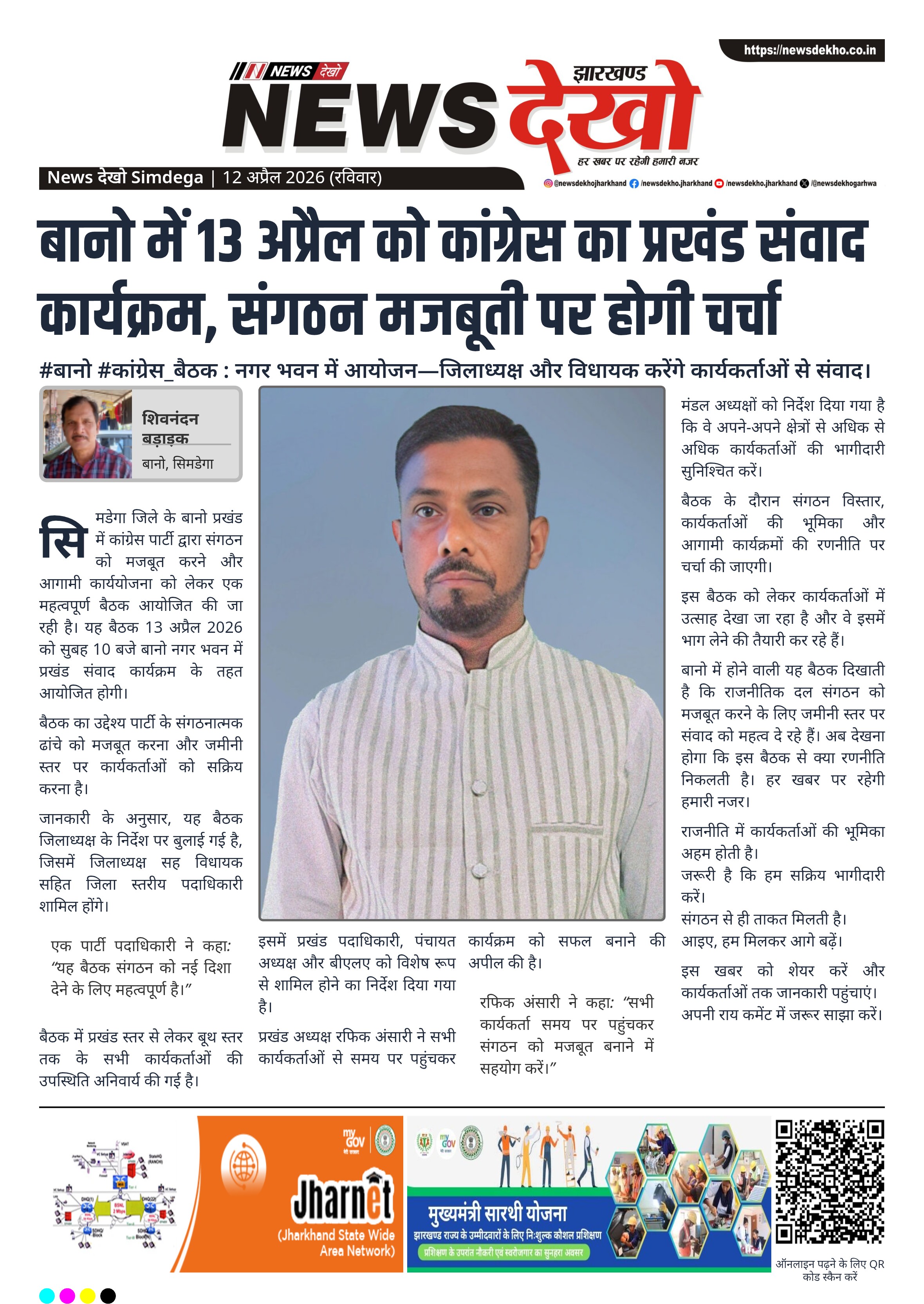 सिमडेगा जिले के बानो प्रखंड में कांग्रेस पार्टी द्वारा संगठन को मजबूत करने और आगामी कार्ययोजना को लेकर एक महत्वपूर्ण बैठक आयोजित की जा रही है। यह बैठक 13 अप्रैल 2026 को सुबह 10 बजे बानो नगर भवन में प्रखंड संवाद कार्यक्रम के तहत आयोजित होगी।