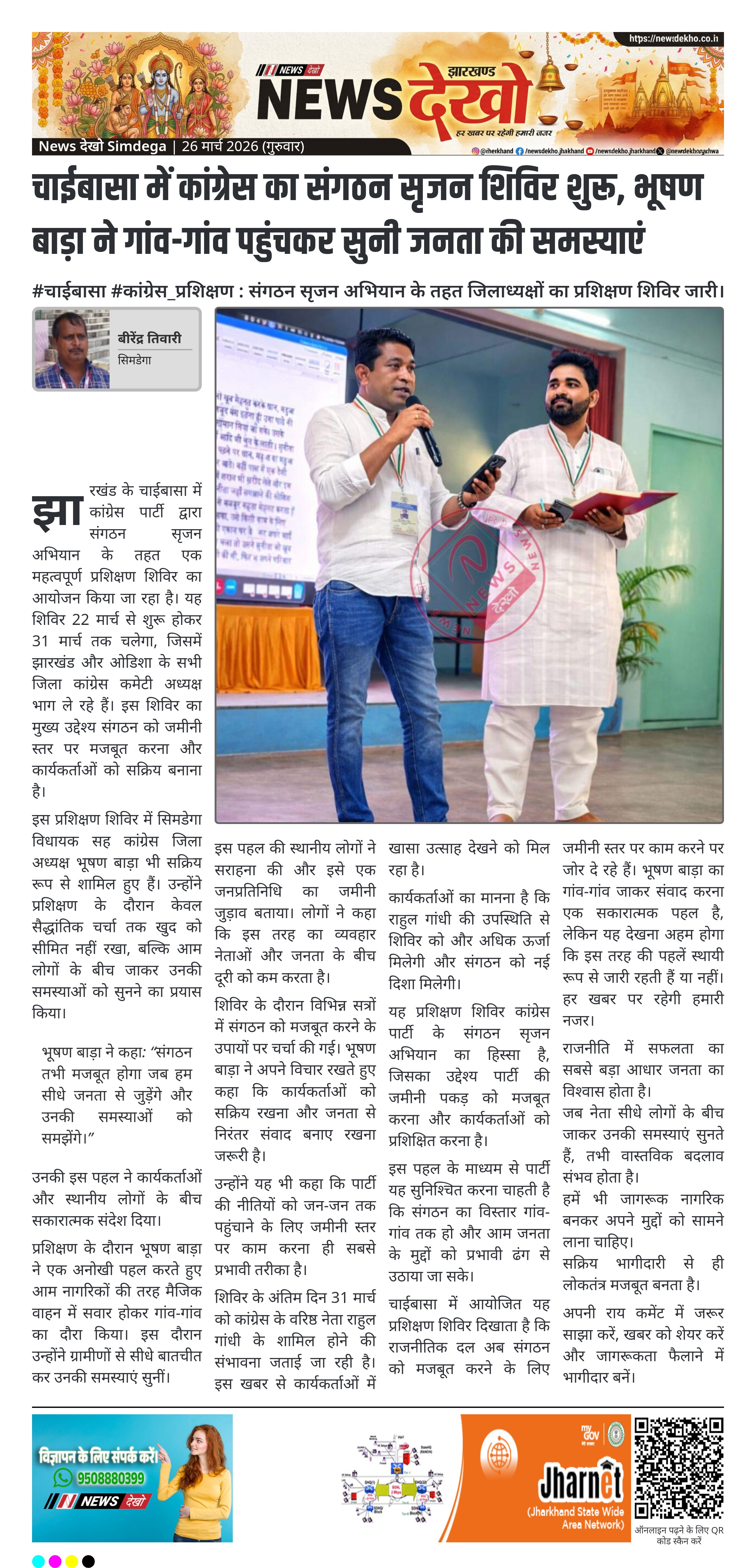 चाईबासा में आयोजित यह प्रशिक्षण शिविर दिखाता है कि राजनीतिक दल अब संगठन को मजबूत करने के लिए जमीनी स्तर पर काम करने पर जोर दे रहे हैं। भूषण बाड़ा का गांव-गांव जाकर संवाद करना एक सकारात्मक पहल है, लेकिन यह देखना अहम होगा कि इस तरह की पहलें स्थायी रूप से जारी रहती हैं या नहीं। हर खबर पर रहेगी हमारी नजर।