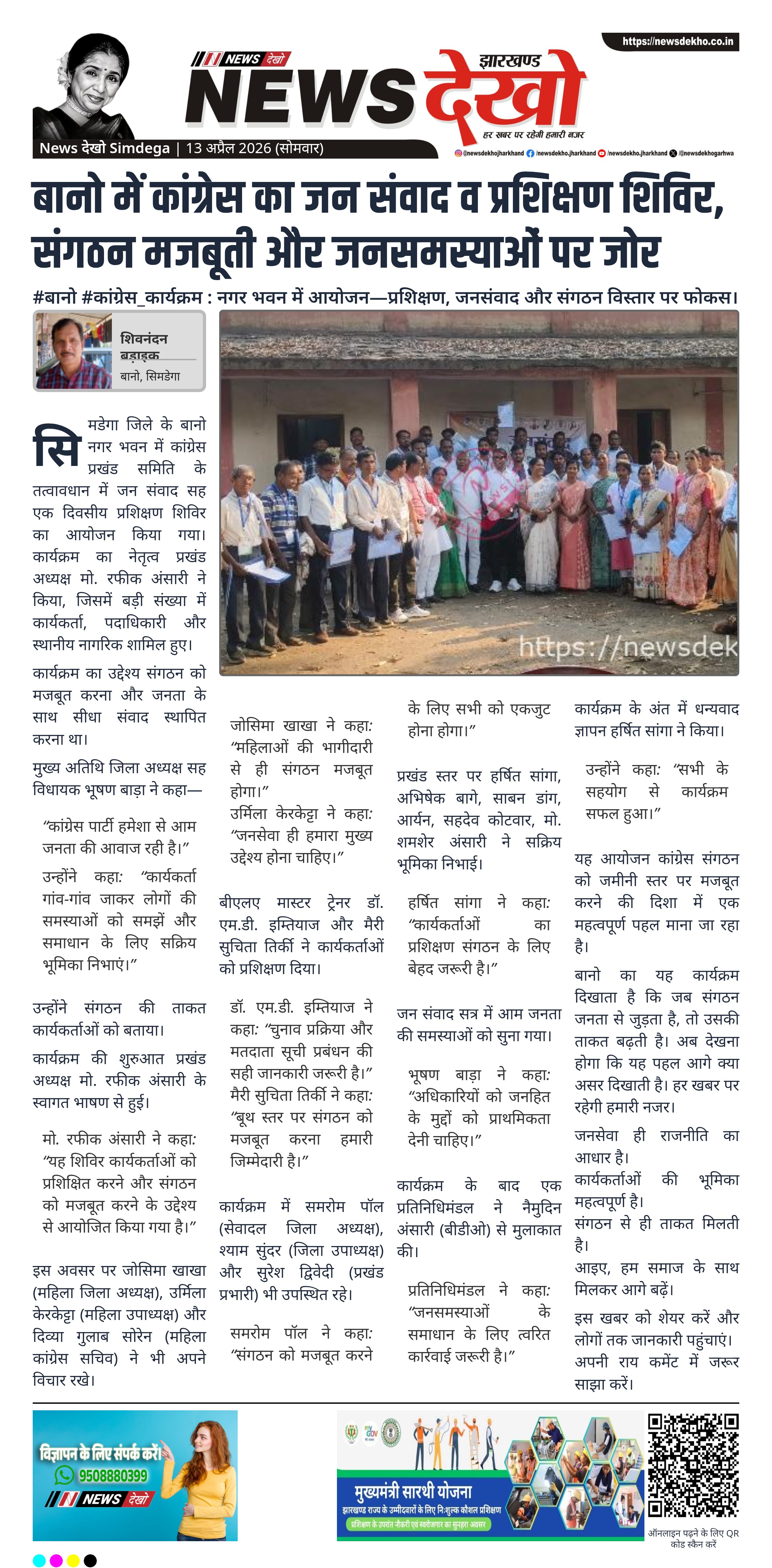 सिमडेगा के बानो में कांग्रेस प्रखंड समिति द्वारा जन संवाद और प्रशिक्षण शिविर आयोजित किया गया। विधायक भूषण बाड़ा ने संगठन को मजबूत करने पर जोर दिया। कार्यकर्ताओं को प्रशिक्षण दिया गया और जन समस्याएं सुनी गईं। कार्यक्रम में बड़ी संख्या में लोग शामिल हुए।