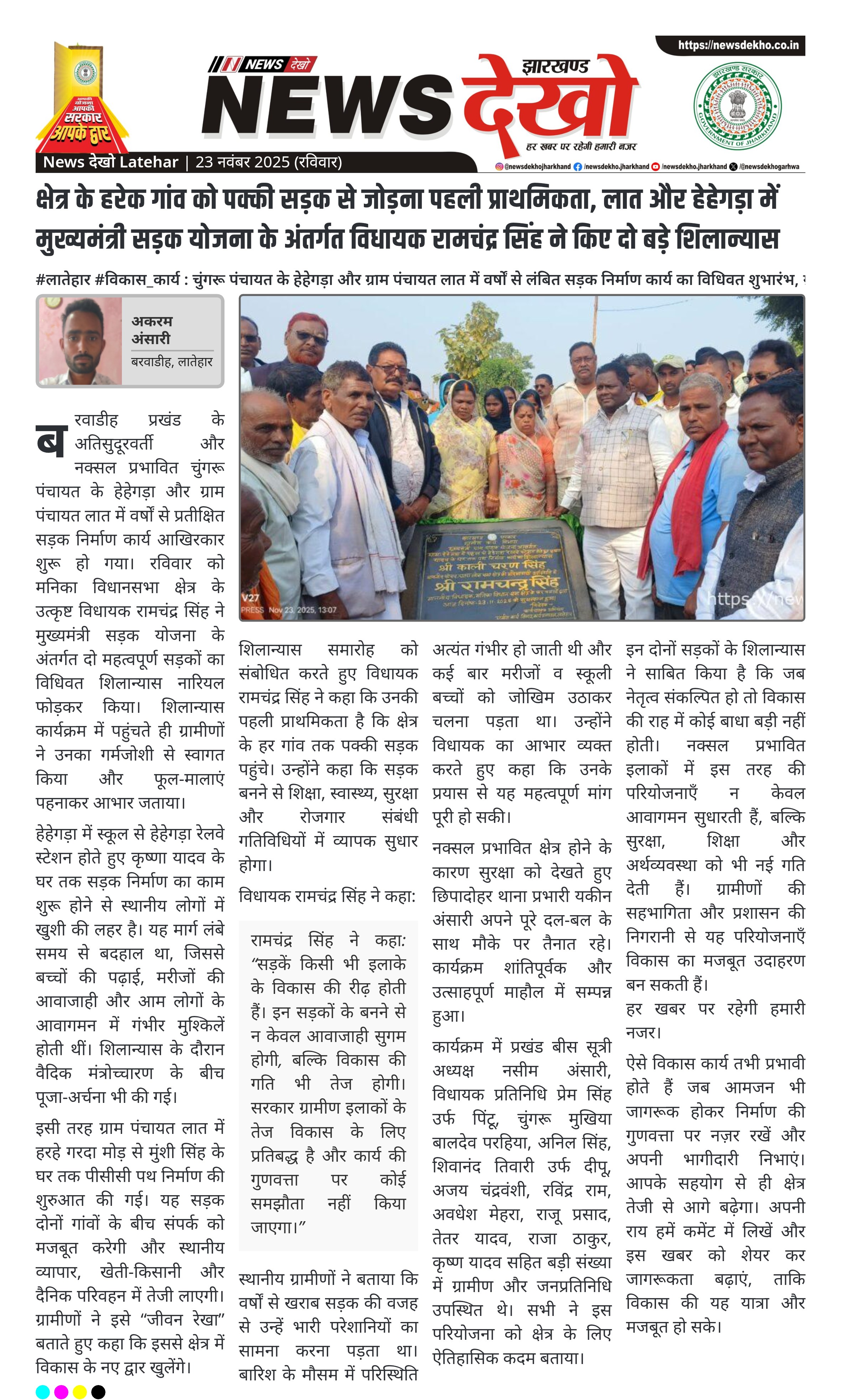 विधायक रामचंद्र सिंह — “सड़कें विकास की रीढ़ हैं”