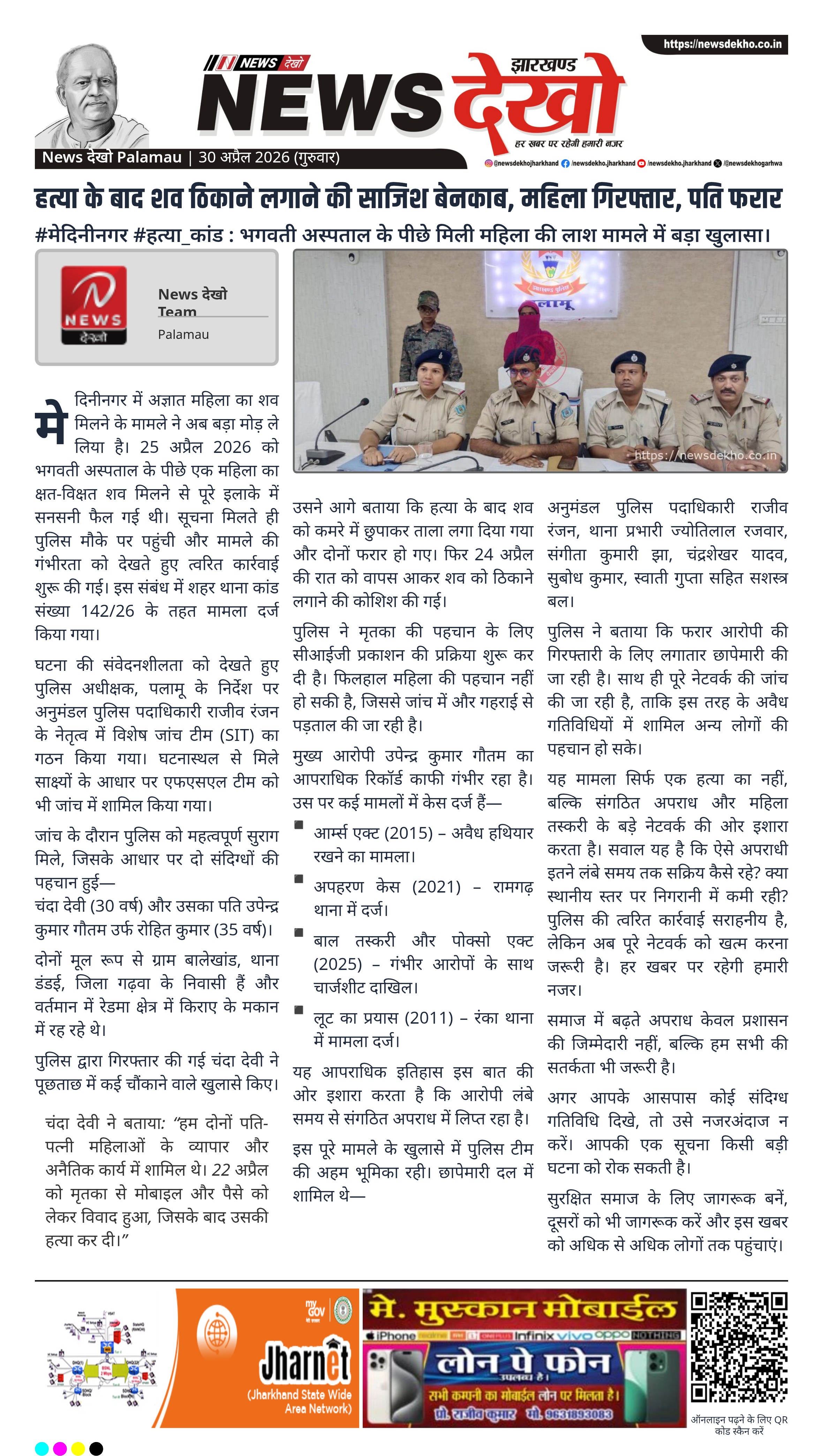 मेदिनीनगर में अज्ञात महिला का शव मिलने के मामले ने अब बड़ा मोड़ ले लिया है। 25 अप्रैल 2026 को भगवती अस्पताल के पीछे एक महिला का क्षत-विक्षत शव मिलने से पूरे इलाके में सनसनी फैल गई थी। सूचना मिलते ही पुलिस मौके पर पहुंची और मामले की गंभीरता को देखते हुए त्वरित कार्रवाई शुरू की गई। इस संबंध में शहर थाना कांड संख्या 142/26 के तहत मामला दर्ज किया गया।