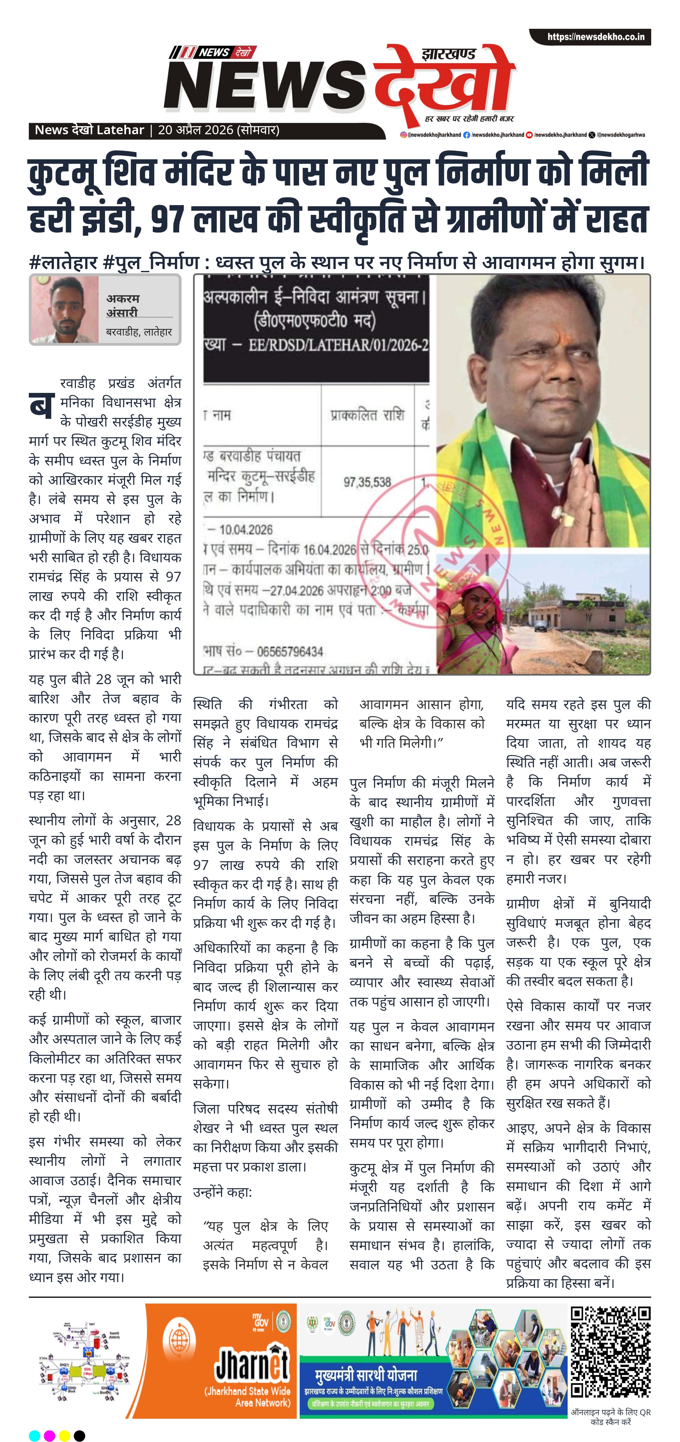 स्थिति की गंभीरता को समझते हुए विधायक रामचंद्र सिंह ने संबंधित विभाग से संपर्क कर पुल निर्माण की स्वीकृति दिलाने में अहम भूमिका निभाई।