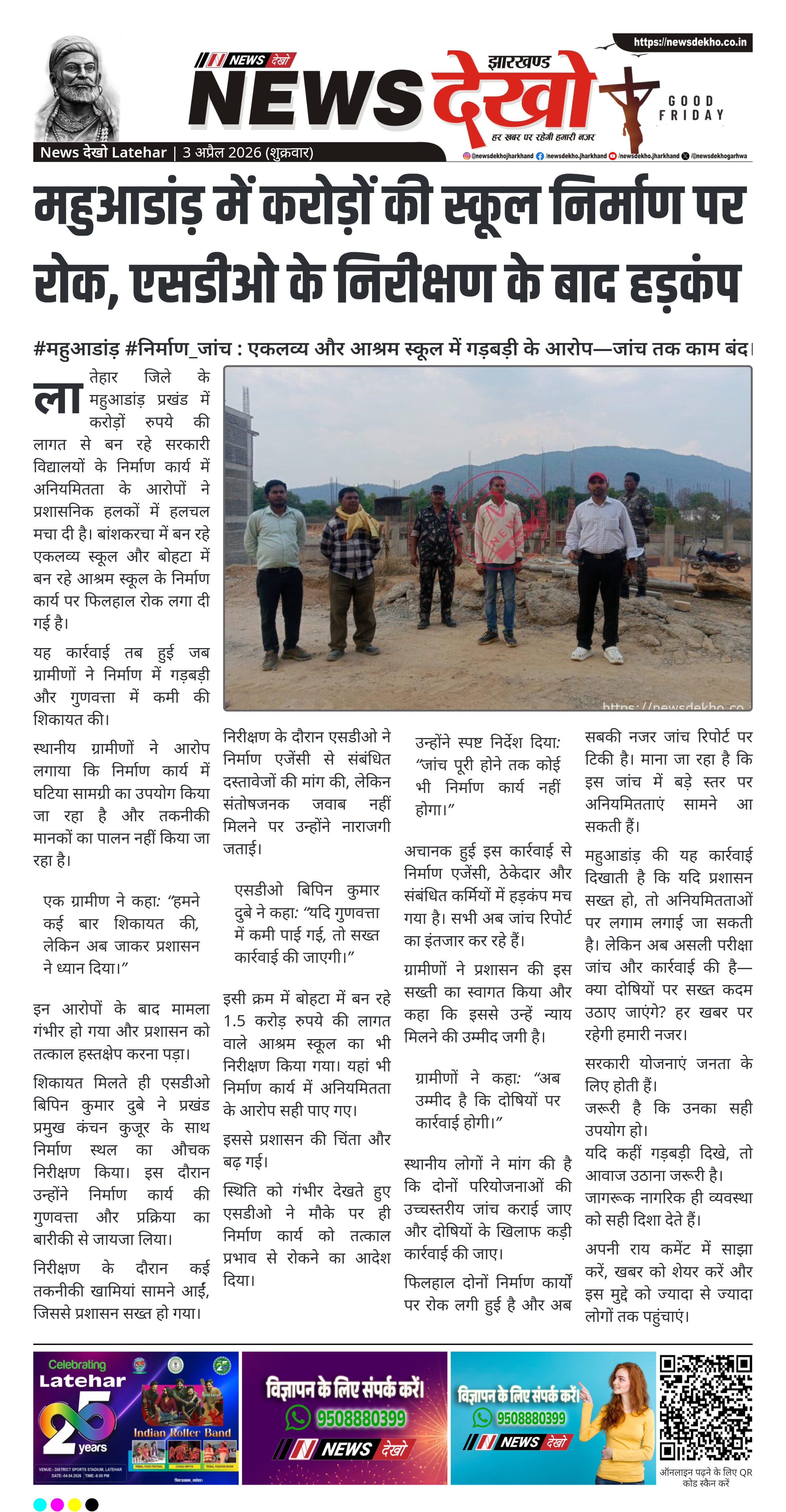 लातेहार के महुआडांड़ प्रखंड में एकलव्य और आश्रम स्कूल निर्माण में अनियमितता की शिकायत पर प्रशासन ने सख्ती दिखाई है। एसडीओ बिपिन कुमार दुबे ने औचक निरीक्षण कर दोनों परियोजनाओं पर जांच तक रोक लगाने का आदेश दिया। ग्रामीणों ने घटिया निर्माण का आरोप लगाया था। कार्रवाई के बाद एजेंसी और ठेकेदारों में हड़कंप मच गया है।