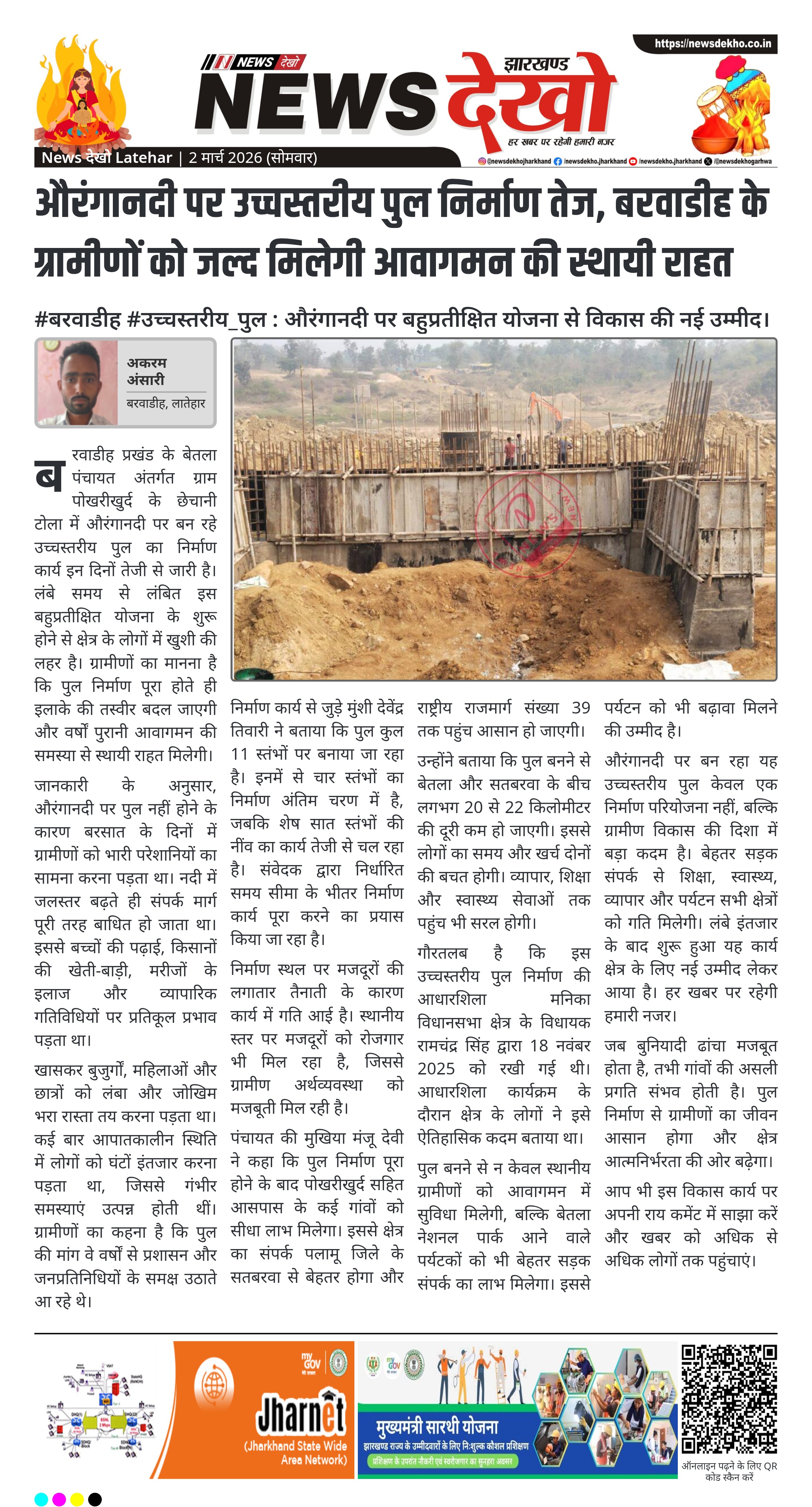 बरवाडीह प्रखंड के बेतला पंचायत अंतर्गत ग्राम पोखरीखुर्द के छेचानी टोला में औरंगानदी पर बन रहे उच्चस्तरीय पुल का निर्माण कार्य इन दिनों तेजी से जारी है। लंबे समय से लंबित इस बहुप्रतीक्षित योजना के शुरू होने से क्षेत्र के लोगों में खुशी की लहर है। ग्रामीणों का मानना है कि पुल निर्माण पूरा होते ही इलाके की तस्वीर बदल जाएगी और वर्षों पुरानी आवागमन की समस्या से स्थायी राहत मिलेगी।