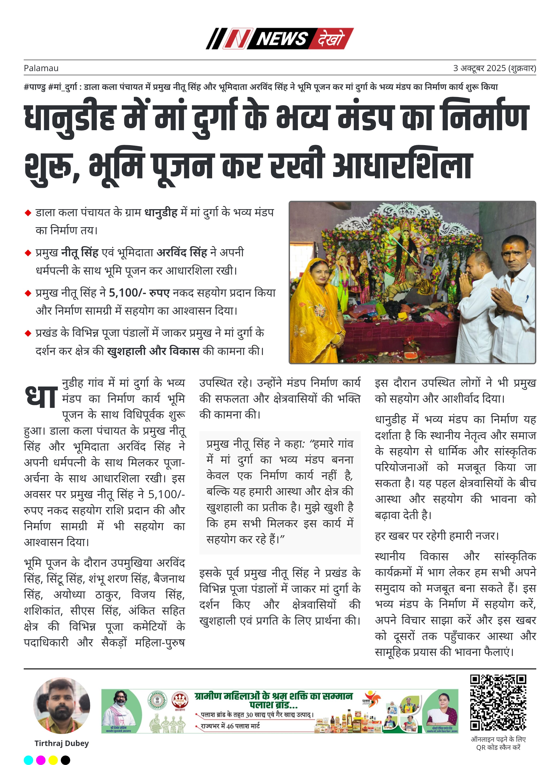 धानुडीह गांव में मां दुर्गा के भव्य मंडप का निर्माण कार्य भूमि पूजन के साथ विधिपूर्वक शुरू हुआ। डाला कला पंचायत के प्रमुख नीतू सिंह और भूमिदाता अरविंद सिंह ने अपनी धर्मपत्नी के साथ मिलकर पूजा-अर्चना के साथ आधारशिला रखी। इस अवसर पर प्रमुख नीतू सिंह ने 5,100/- रुपए नकद सहयोग राशि प्रदान की और निर्माण सामग्री में भी सहयोग का आश्वासन दिया।