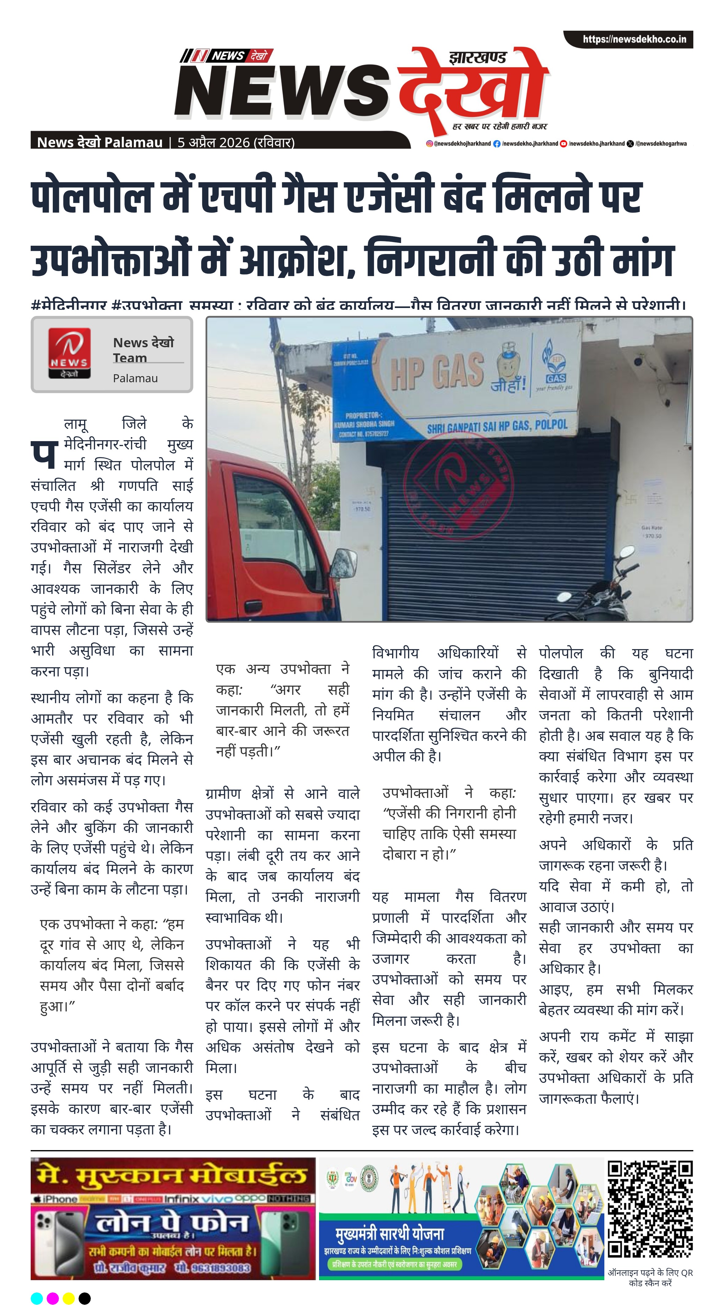 पलामू के मेदिनीनगर-पोलपोल क्षेत्र में एचपी गैस एजेंसी का कार्यालय रविवार को बंद मिलने से उपभोक्ताओं को परेशानी हुई। गैस लेने और जानकारी के लिए पहुंचे लोग निराश लौटे। उपभोक्ताओं ने नियमित संचालन और निगरानी की मांग की है। फोन नंबर भी काम नहीं करने से नाराजगी बढ़ी है।
