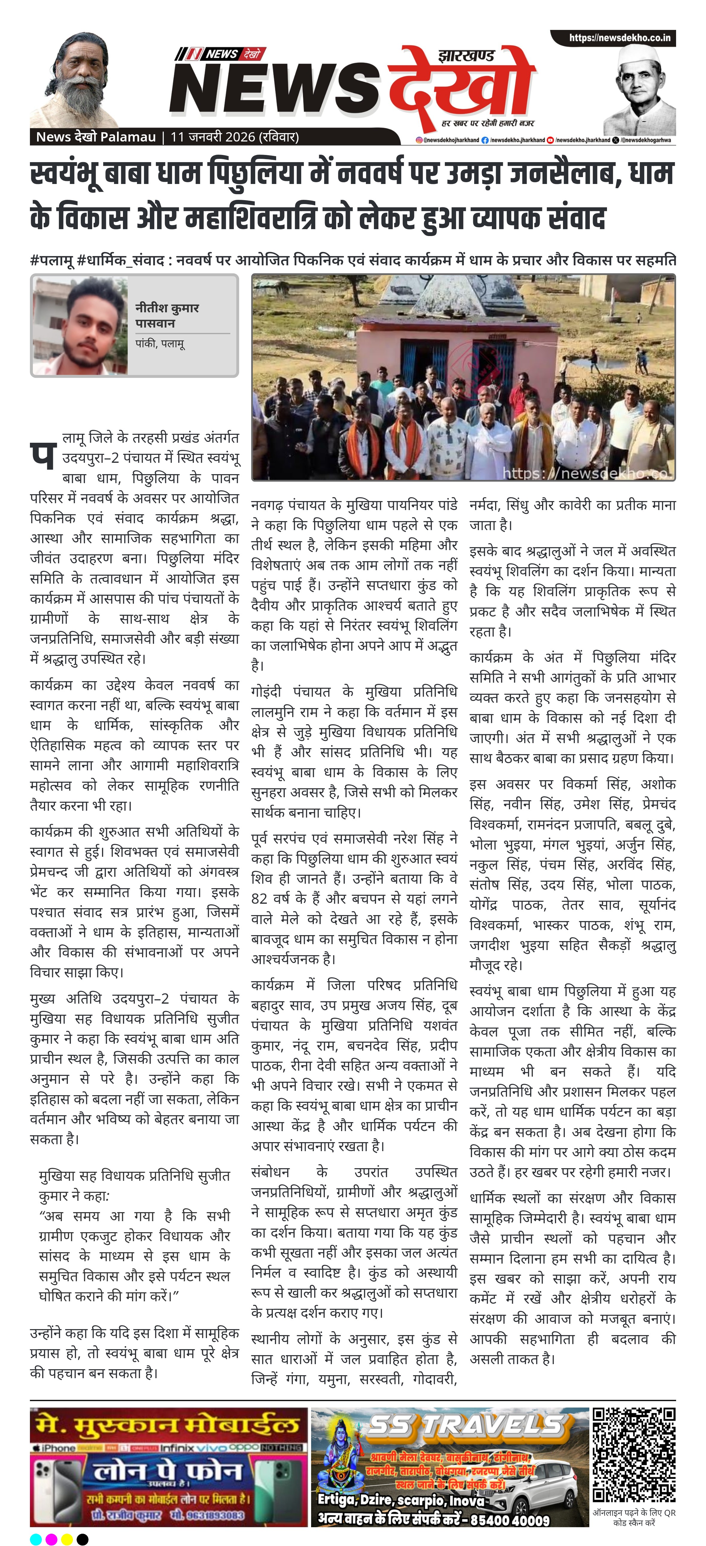 पलामू जिले के तरहसी प्रखंड अंतर्गत पिछुलिया स्थित स्वयंभू बाबा धाम परिसर में नववर्ष के अवसर पर पिकनिक एवं संवाद कार्यक्रम का आयोजन किया गया। कार्यक्रम में पांच पंचायतों के ग्रामीणों, जनप्रतिनिधियों और समाजसेवियों ने भाग लेकर धाम के धार्मिक और ऐतिहासिक महत्व पर चर्चा की। महाशिवरात्रि महोत्सव की तैयारियों और धाम के समुचित विकास को लेकर सामूहिक विमर्श हुआ। सभी वक्ताओं ने इसे क्षेत्रीय आस्था और धार्मिक पर्यटन से जोड़ने की आवश्यकता पर बल दिया।