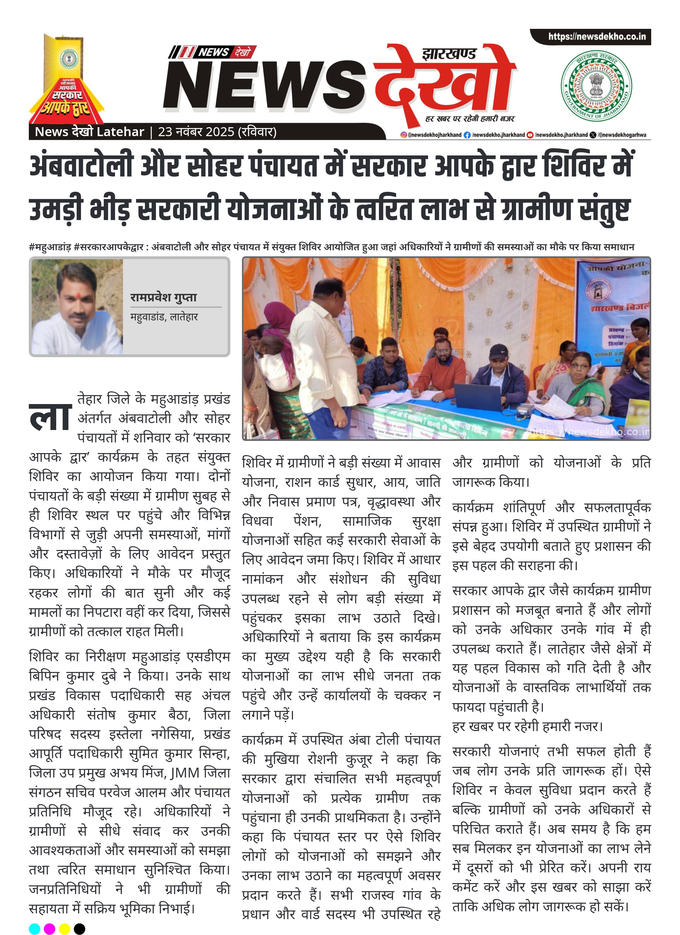 लातेहार जिले के महुआडांड़ प्रखंड अंतर्गत अंबवाटोली और सोहर पंचायतों में शनिवार को ‘सरकार आपके द्वार’ कार्यक्रम के तहत संयुक्त शिविर का आयोजन किया गया। दोनों पंचायतों के बड़ी संख्या में ग्रामीण सुबह से ही शिविर स्थल पर पहुंचे और विभिन्न विभागों से जुड़ी अपनी समस्याओं, मांगों और दस्तावेज़ों के लिए आवेदन प्रस्तुत किए। अधिकारियों ने मौके पर मौजूद रहकर लोगों की बात सुनी और कई मामलों का निपटारा वहीं कर दिया, जिससे ग्रामीणों को तत्काल राहत मिली।