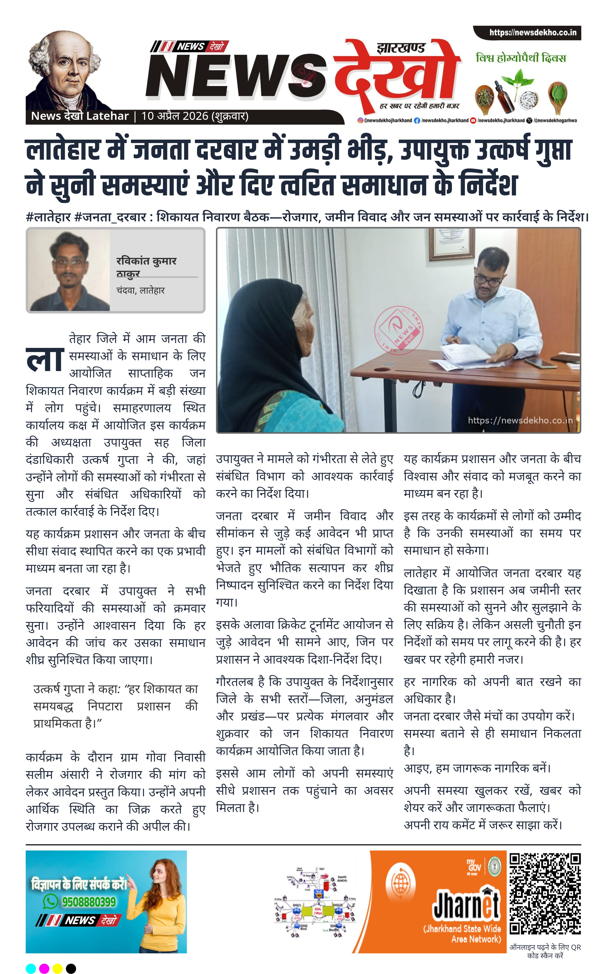 - उत्कर्ष गुप्ता (उपायुक्त) ने जनता दरबार में शिकायतें सुनीं।