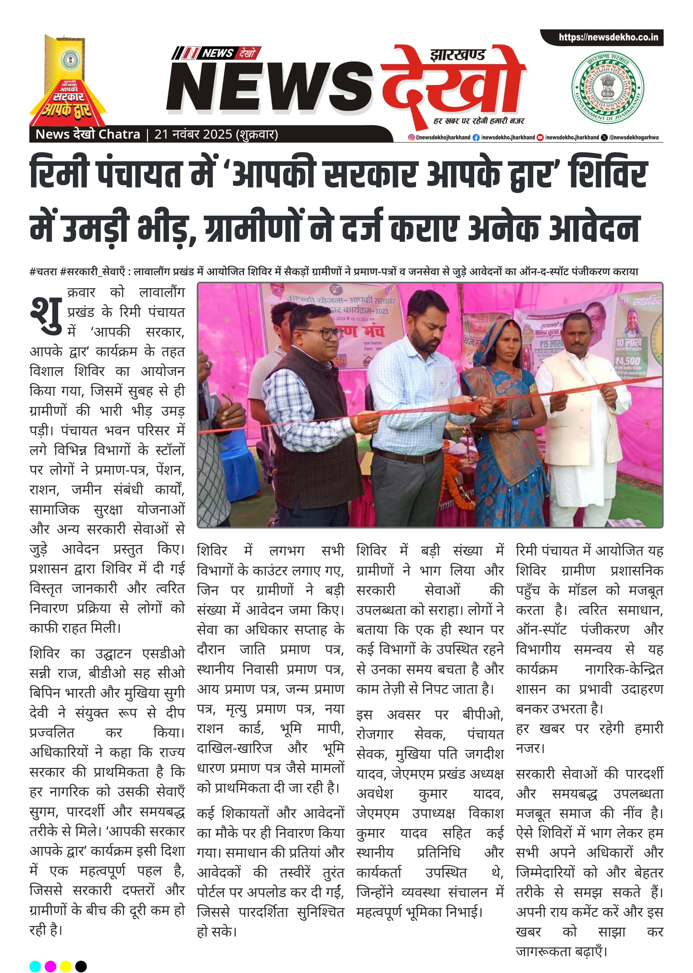 शिविर का उद्घाटन एसडीओ सन्नी राज, बीडीओ सह सीओ बिपिन भारती और मुखिया सुगी देवी ने संयुक्त रूप से दीप प्रज्वलित कर किया। अधिकारियों ने कहा कि राज्य सरकार की प्राथमिकता है कि हर नागरिक को उसकी सेवाएँ सुगम, पारदर्शी और समयबद्ध तरीके से मिले। ‘आपकी सरकार आपके द्वार’ कार्यक्रम इसी दिशा में एक महत्वपूर्ण पहल है, जिससे सरकारी दफ्तरों और ग्रामीणों के बीच की दूरी कम हो रही है।