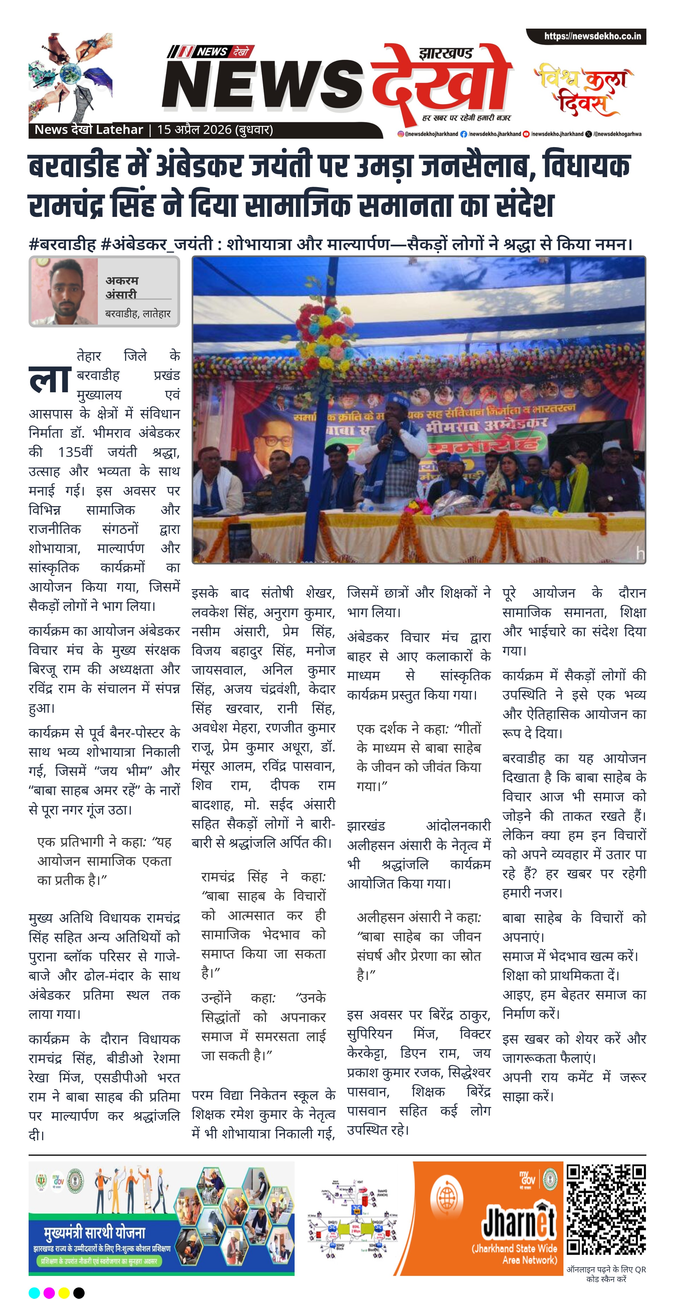 लातेहार जिले के बरवाडीह प्रखंड मुख्यालय एवं आसपास के क्षेत्रों में संविधान निर्माता डॉ. भीमराव अंबेडकर की 135वीं जयंती श्रद्धा, उत्साह और भव्यता के साथ मनाई गई। इस अवसर पर विभिन्न सामाजिक और राजनीतिक संगठनों द्वारा शोभायात्रा, माल्यार्पण और सांस्कृतिक कार्यक्रमों का आयोजन किया गया, जिसमें सैकड़ों लोगों ने भाग लिया।