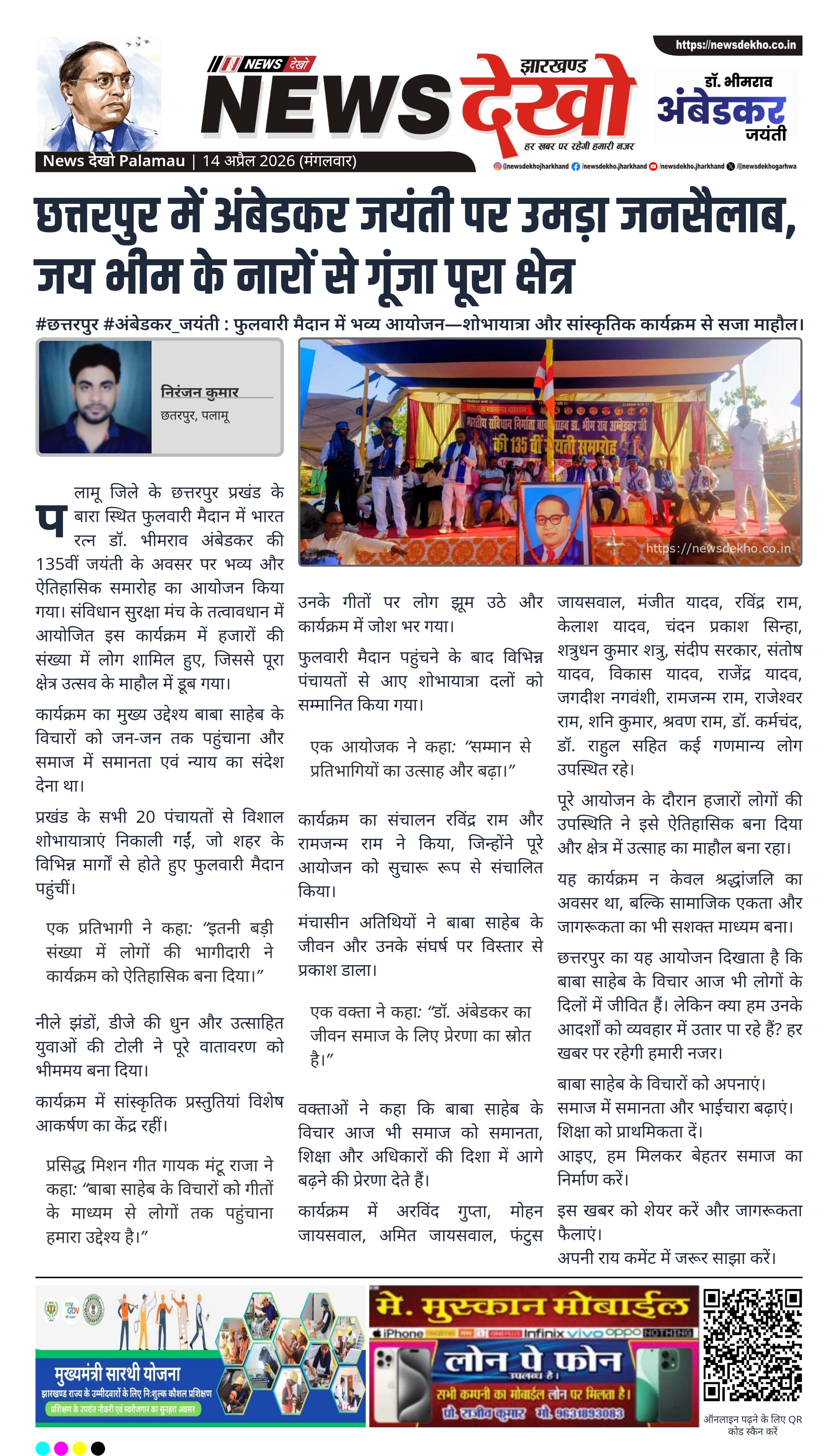 पलामू जिले के छत्तरपुर प्रखंड के बारा स्थित फुलवारी मैदान में भारत रत्न डॉ. भीमराव अंबेडकर की 135वीं जयंती के अवसर पर भव्य और ऐतिहासिक समारोह का आयोजन किया गया। संविधान सुरक्षा मंच के तत्वावधान में आयोजित इस कार्यक्रम में हजारों की संख्या में लोग शामिल हुए, जिससे पूरा क्षेत्र उत्सव के माहौल में डूब गया।