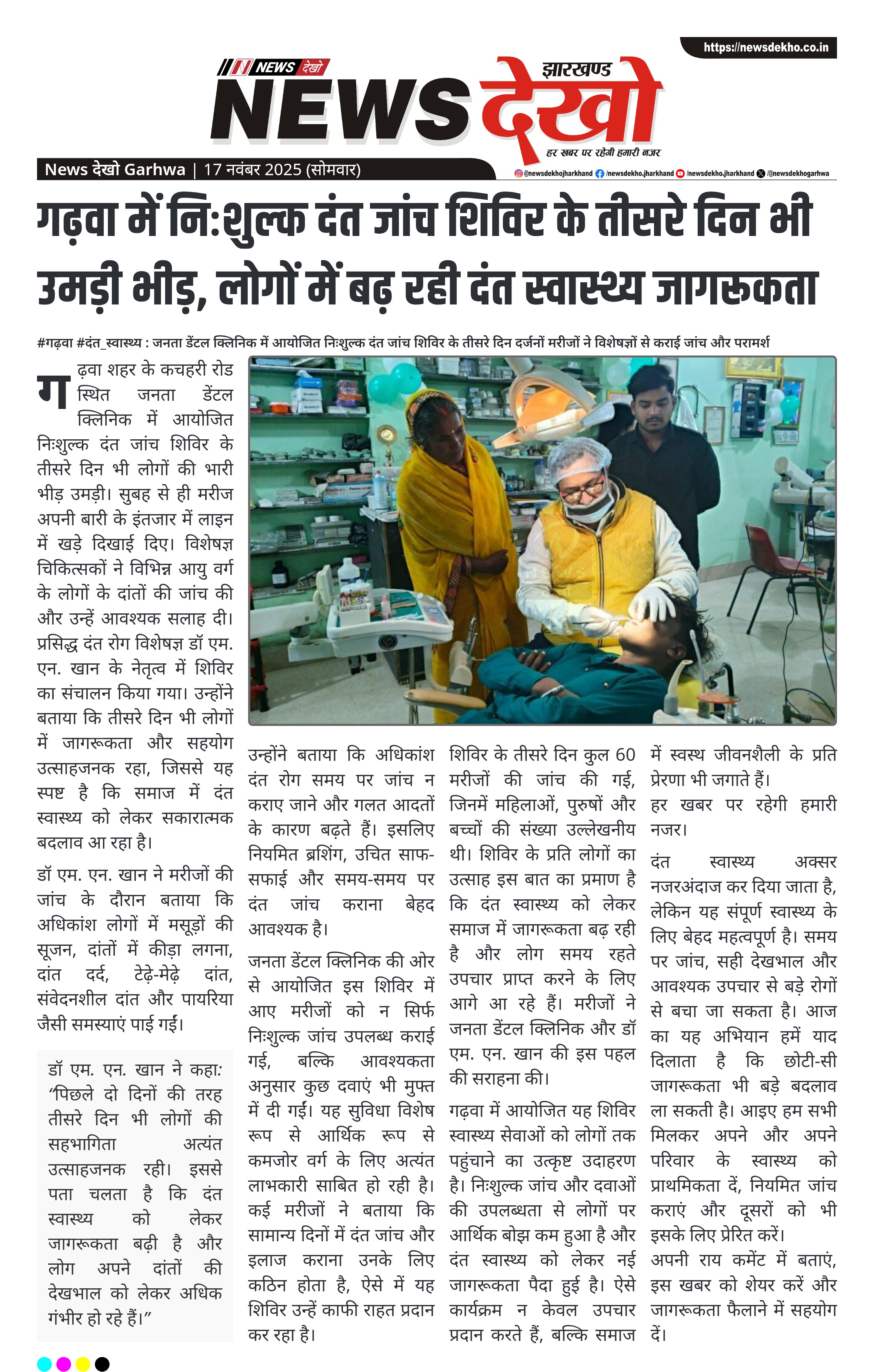 #गढ़वा #दंत_स्वास्थ्य : जनता डेंटल क्लिनिक में आयोजित निःशुल्क दंत जांच शिविर के तीसरे दिन दर्जनों मरीजों ने विशेषज्ञों से कराई जांच और परामर्श
