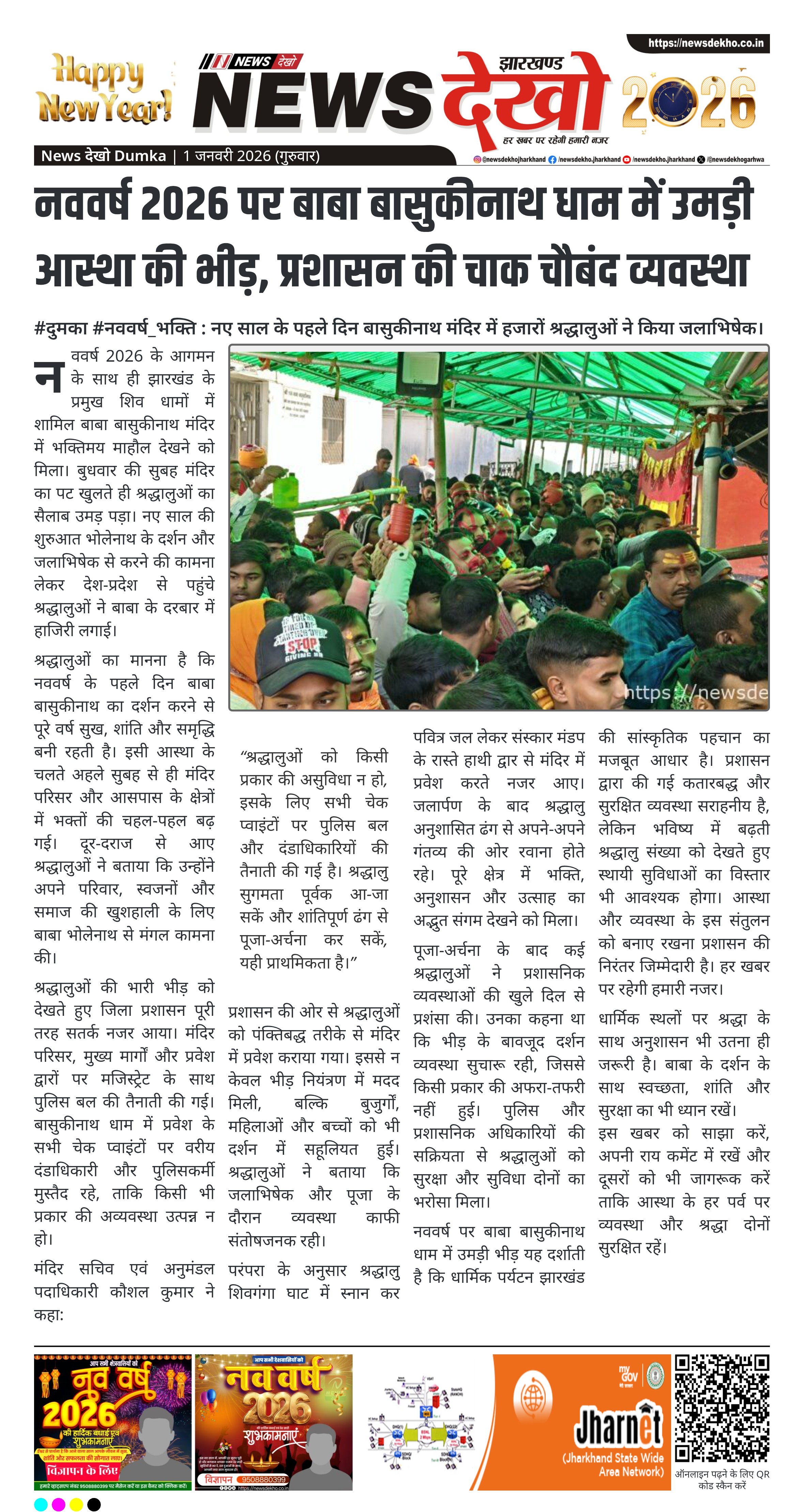 नववर्ष 2026 के अवसर पर दुमका जिले के प्रसिद्ध फौजदारी दरबार बाबा बासुकीनाथ मंदिर में हजारों श्रद्धालु आस्था के साथ पहुंचे। अहले सुबह मंदिर का पट खुलते ही पूजा-अर्चना और जलाभिषेक के लिए भक्तों की लंबी कतारें लग गईं। भीड़ को नियंत्रित करने और श्रद्धालुओं को सुगमता प्रदान करने के लिए प्रशासन ने मजिस्ट्रेट और पुलिस बल की व्यापक तैनाती की। कतारबद्ध दर्शन और सुव्यवस्थित प्रवेश व्यवस्था के चलते श्रद्धालुओं ने संतोष व्यक्त किया।