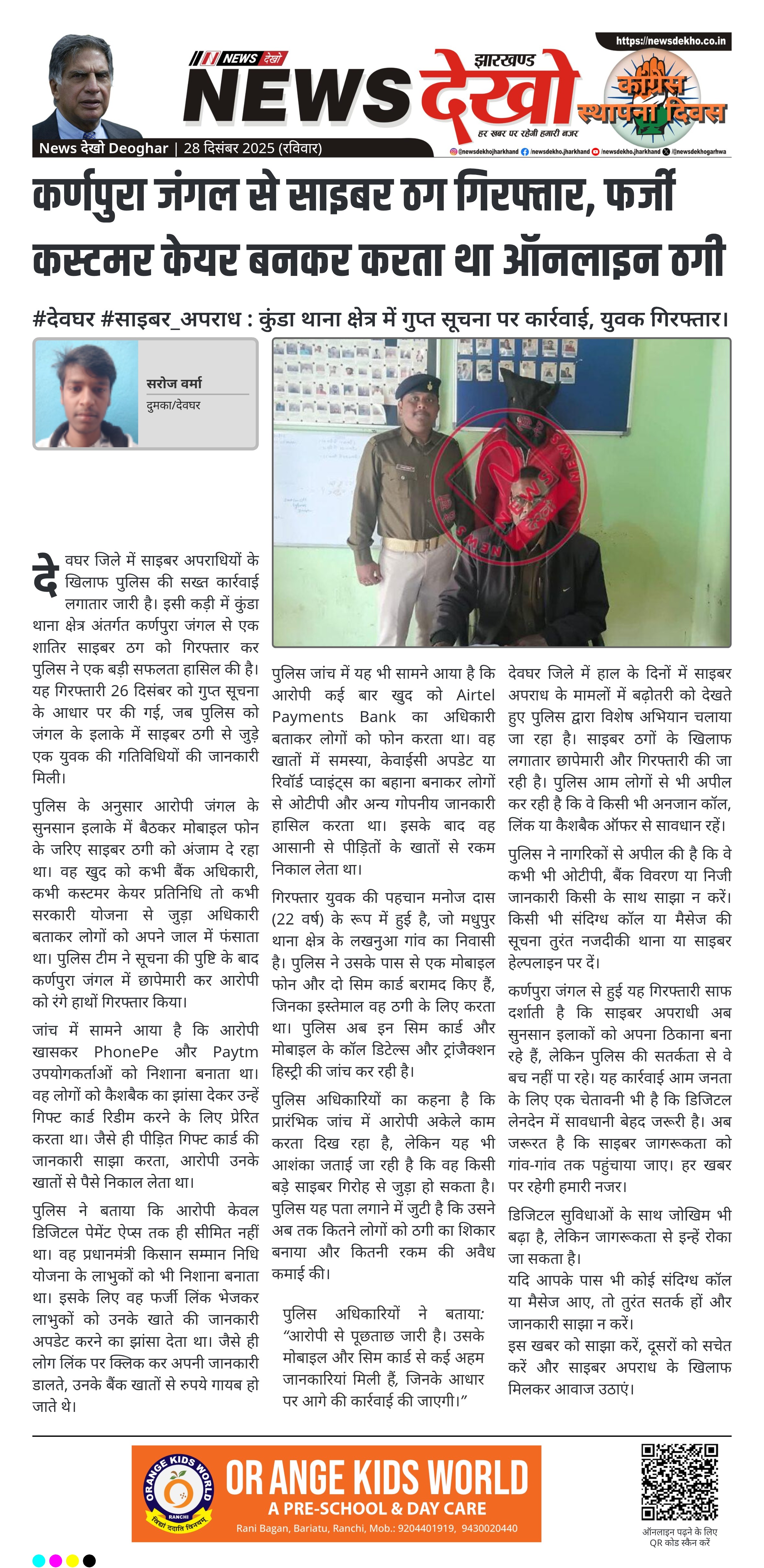 देवघर जिले में साइबर अपराधियों के खिलाफ पुलिस की सख्त कार्रवाई लगातार जारी है। इसी कड़ी में कुंडा थाना क्षेत्र अंतर्गत कर्णपुरा जंगल से एक शातिर साइबर ठग को गिरफ्तार कर पुलिस ने एक बड़ी सफलता हासिल की है। यह गिरफ्तारी 26 दिसंबर को गुप्त सूचना के आधार पर की गई, जब पुलिस को जंगल के इलाके में साइबर ठगी से जुड़े एक युवक की गतिविधियों की जानकारी मिली।