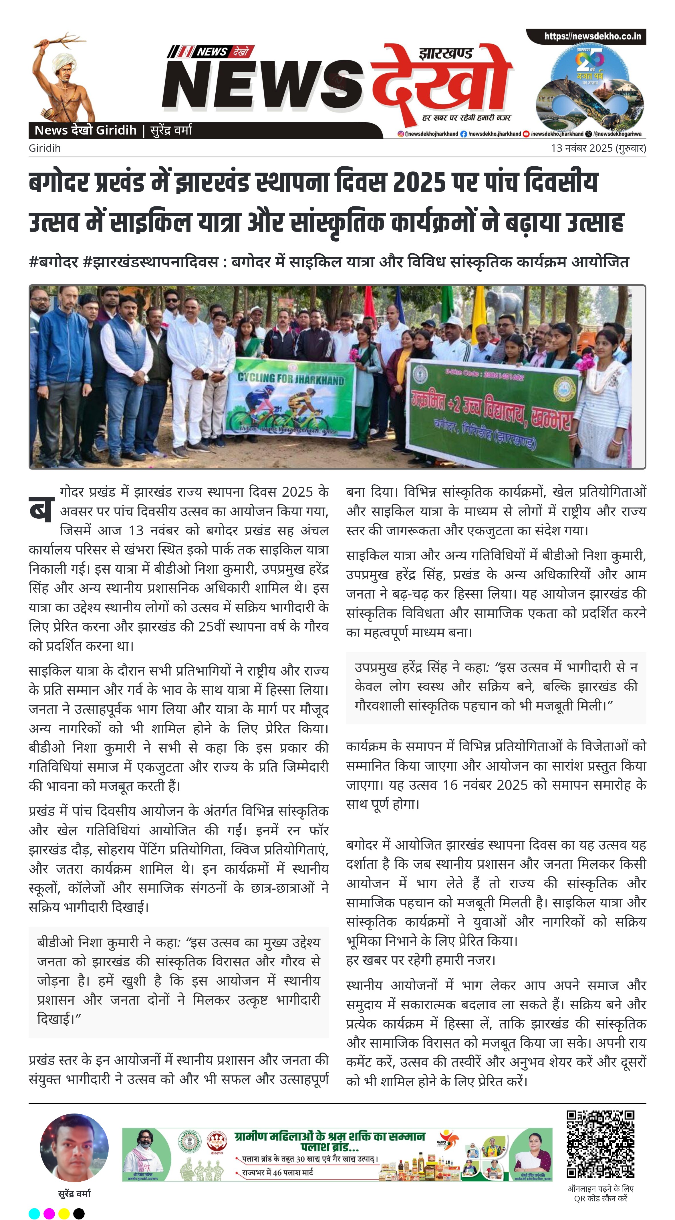 बगोदर प्रखंड में झारखंड राज्य स्थापना दिवस 2025 के अवसर पर पांच दिवसीय उत्सव का आयोजन किया गया, जिसमें आज 13 नवंबर को बगोदर प्रखंड सह अंचल कार्यालय परिसर से खंभरा स्थित इको पार्क तक साइकिल यात्रा निकाली गई। इस यात्रा में बीडीओ निशा कुमारी, उपप्रमुख हरेंद्र सिंह और अन्य स्थानीय प्रशासनिक अधिकारी शामिल थे। इस यात्रा का उद्देश्य स्थानीय लोगों को उत्सव में सक्रिय भागीदारी के लिए प्रेरित करना और झारखंड की 25वीं स्थापना वर्ष के गौरव को प्रदर्शित करना था।