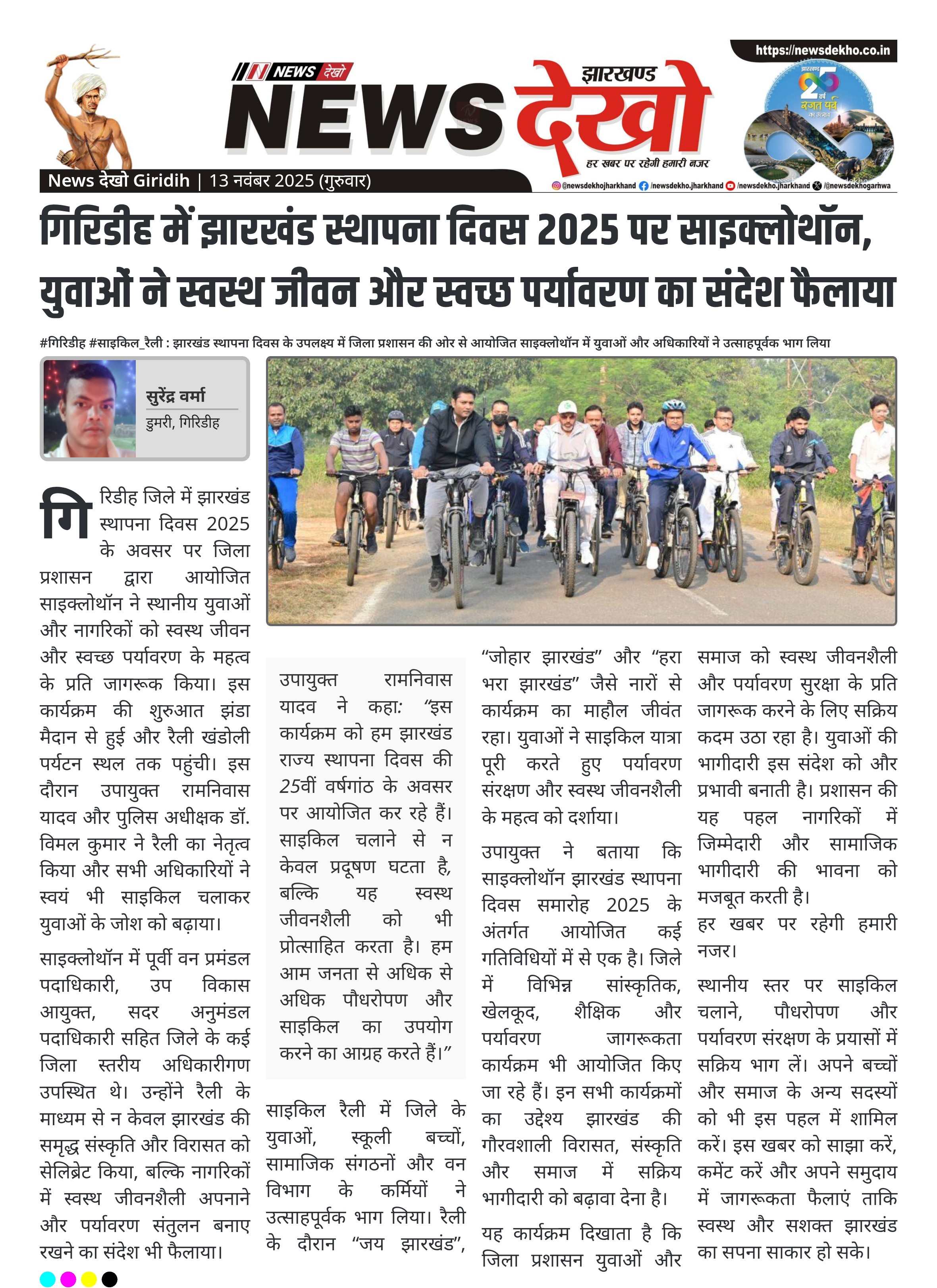 • गिरिडीह में झारखंड स्थापना दिवस 2025 पर साइक्लोथॉन का आयोजन।