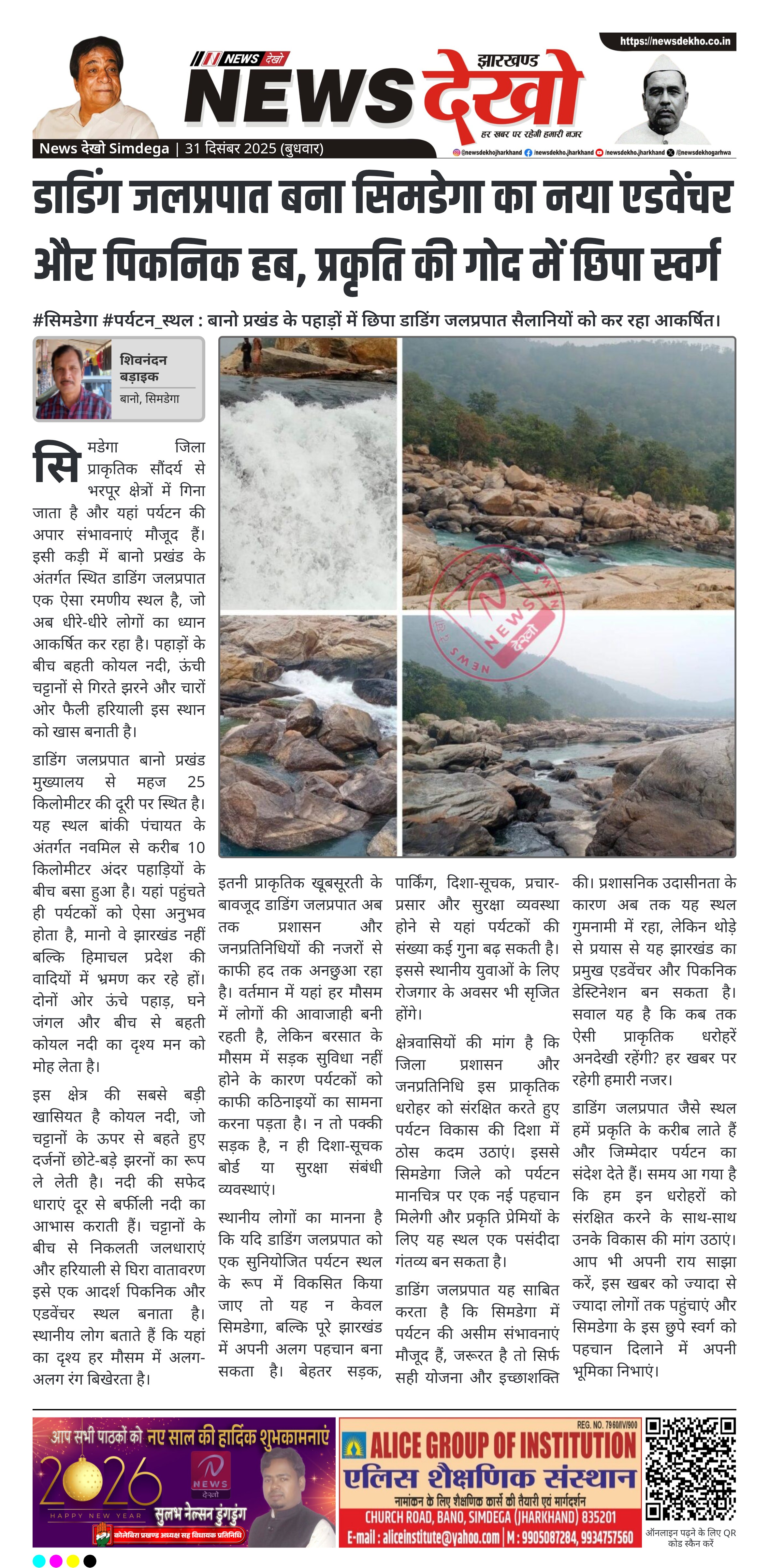 सिमडेगा जिले के बानो प्रखंड में स्थित डाडिंग जलप्रपात अपनी मनोरम प्राकृतिक छटाओं और एडवेंचर संभावनाओं के कारण चर्चा में है। पहाड़ों, हरियाली और कोयल नदी की कलकल धाराओं से घिरा यह क्षेत्र एक संभावनाशील पर्यटन स्थल के रूप में उभर रहा है। अब तक प्रशासनिक नजरों से दूर रहा यह स्थल बेहतर बुनियादी सुविधाओं के अभाव में सीमित पहचान रखता है। स्थानीय लोगों और पर्यटकों की मांग है कि इसे विकसित कर सिमडेगा के प्रमुख पिकनिक स्पॉट के रूप में स्थापित किया जाए।