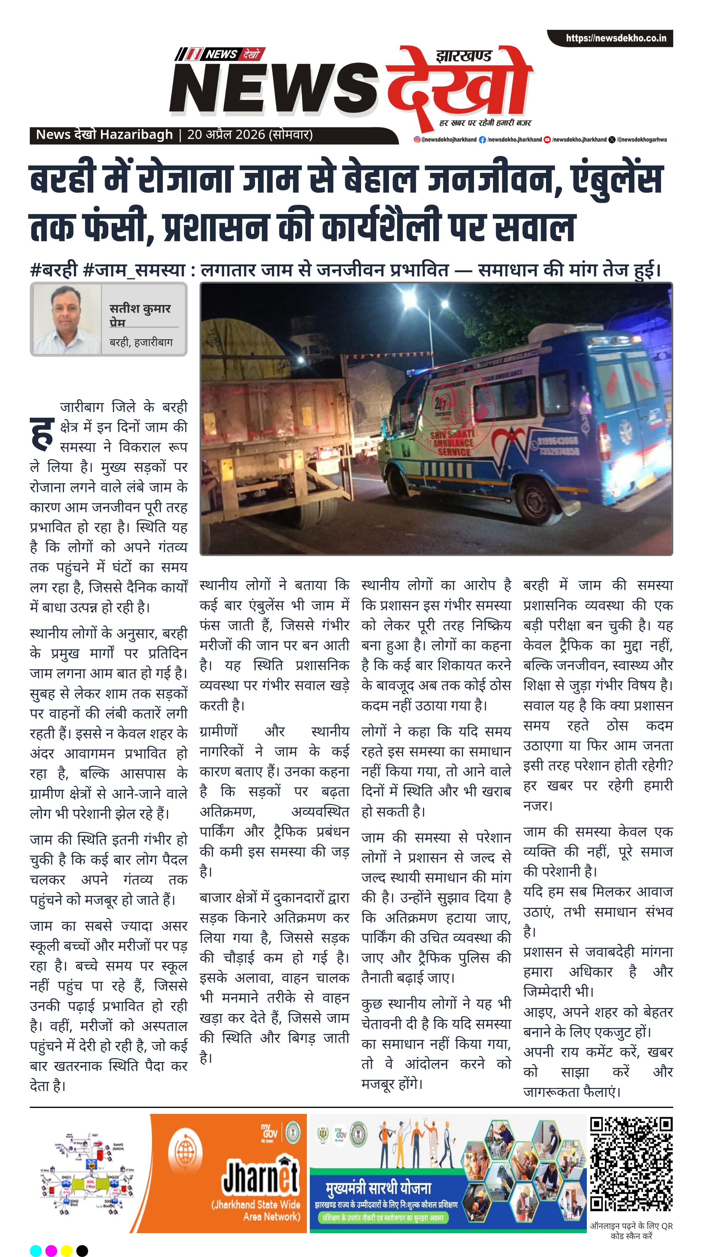 हजारीबाग जिले के बरही क्षेत्र में लगातार लग रहे भीषण जाम से आम जनजीवन अस्त-व्यस्त हो गया है। रोजाना घंटों तक सड़कों पर वाहनों की लंबी कतारें लग रही हैं, जिससे स्कूली बच्चों, मरीजों और कामकाजी लोगों को भारी परेशानी हो रही है। स्थानीय लोगों ने प्रशासन पर निष्क्रियता का आरोप लगाया है। जाम की समस्या को लेकर अब स्थायी समाधान की मांग तेज हो गई है।