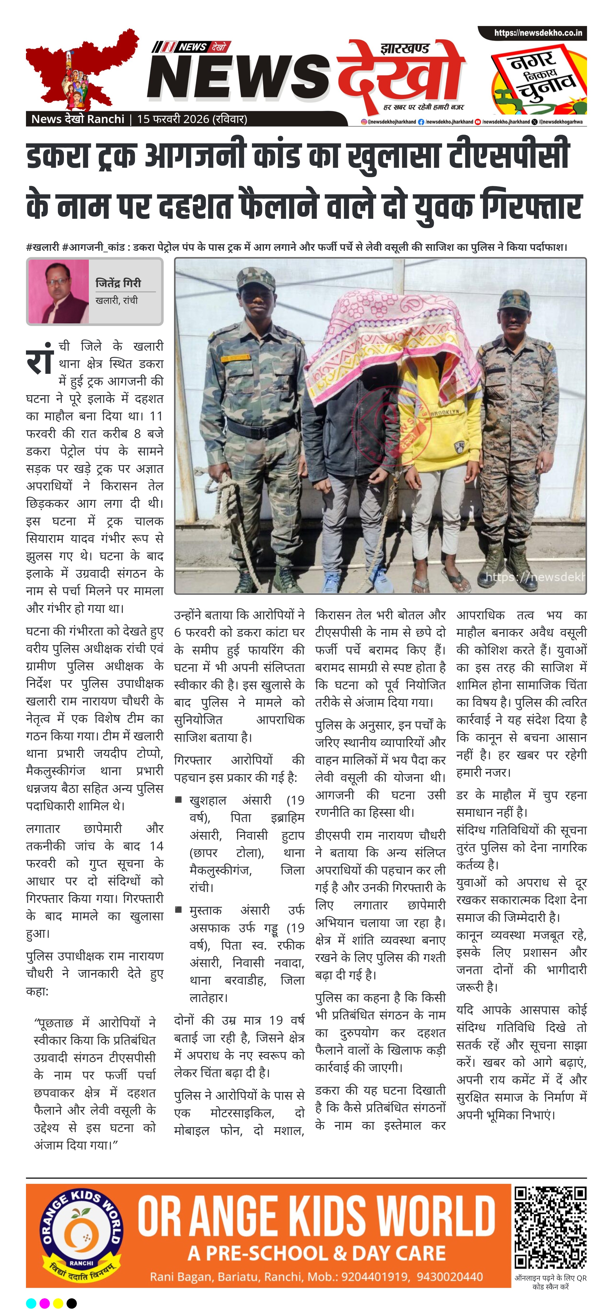 रांची जिले के खलारी थाना क्षेत्र अंतर्गत डकरा में 11 फरवरी की रात ट्रक में आगजनी की सनसनीखेज घटना का पुलिस ने खुलासा कर दिया है। प्रतिबंधित उग्रवादी संगठन टीएसपीसी के नाम पर दहशत फैलाकर लेवी वसूली की साजिश रची गई थी। पुलिस ने विशेष टीम गठित कर दो आरोपियों को गिरफ्तार किया है और अन्य की तलाश जारी है।