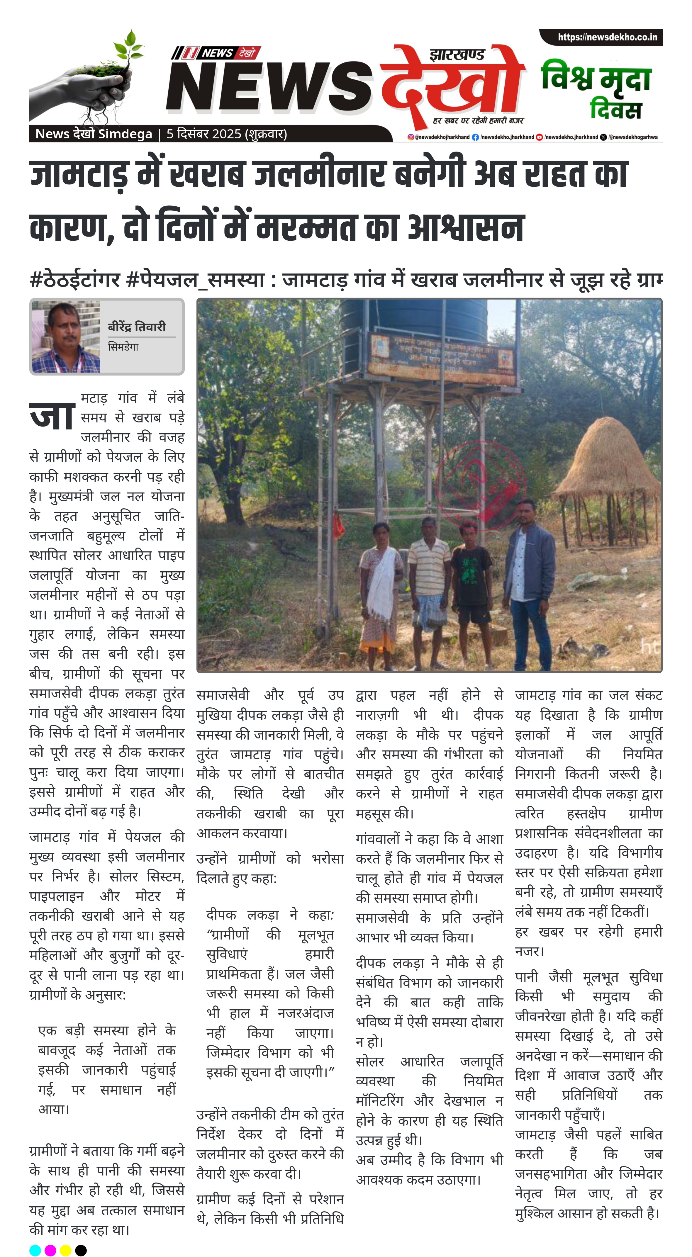 समाजसेवी और पूर्व उप मुखिया दीपक लकड़ा जैसे ही समस्या की जानकारी मिली, वे तुरंत जामटाड़ गांव पहुंचे। मौके पर लोगों से बातचीत की, स्थिति देखी और तकनीकी खराबी का पूरा आकलन करवाया।