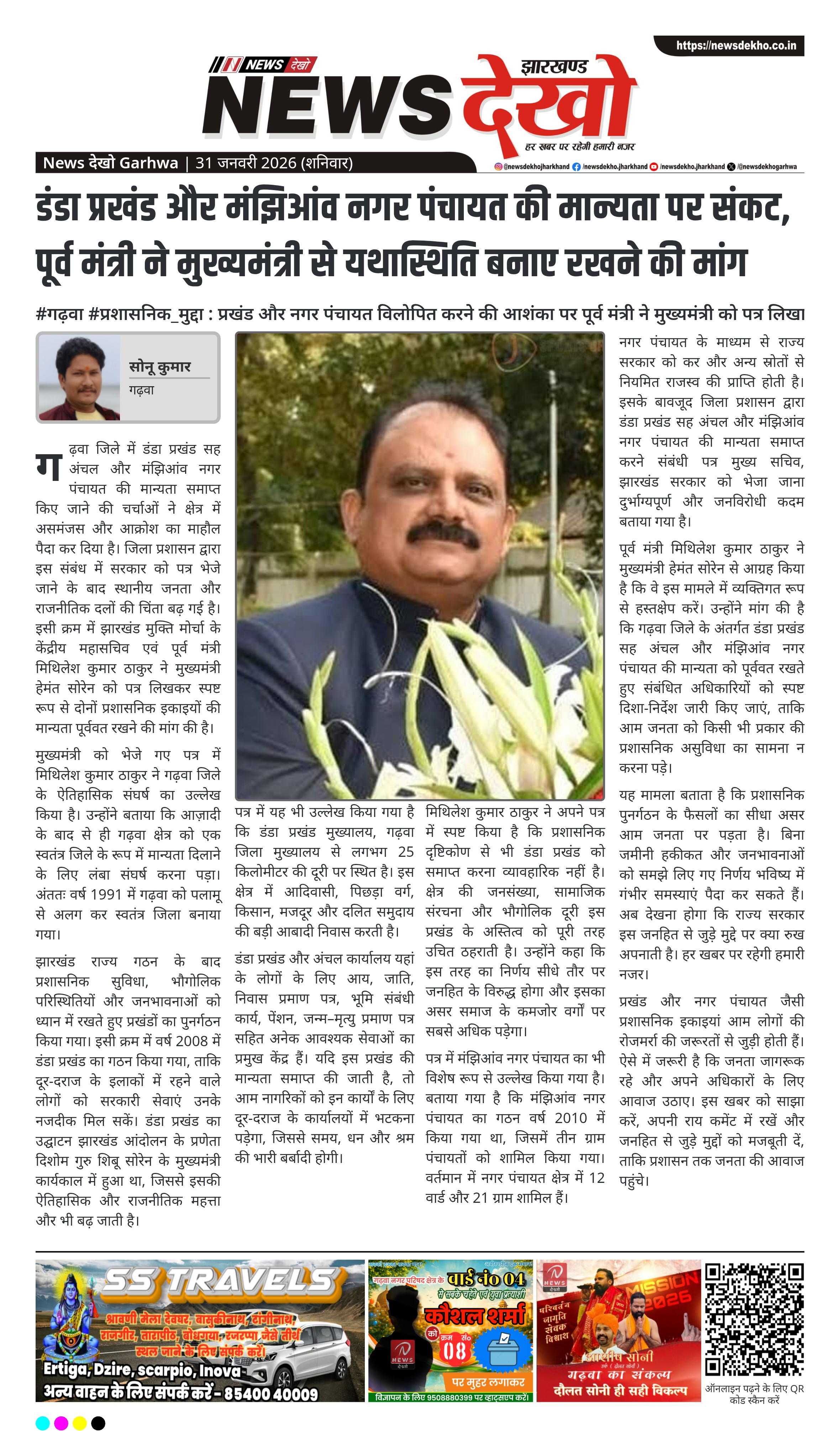 गढ़वा जिले में डंडा प्रखंड सह अंचल और मंझिआंव नगर पंचायत की मान्यता समाप्त किए जाने की चर्चाओं ने क्षेत्र में असमंजस और आक्रोश का माहौल पैदा कर दिया है। जिला प्रशासन द्वारा इस संबंध में सरकार को पत्र भेजे जाने के बाद स्थानीय जनता और राजनीतिक दलों की चिंता बढ़ गई है। इसी क्रम में झारखंड मुक्ति मोर्चा के केंद्रीय महासचिव एवं पूर्व मंत्री मिथिलेश कुमार ठाकुर ने मुख्यमंत्री हेमंत सोरेन को पत्र लिखकर स्पष्ट रूप से दोनों प्रशासनिक इकाइयों की मान्यता पूर्ववत रखने की मांग की है।