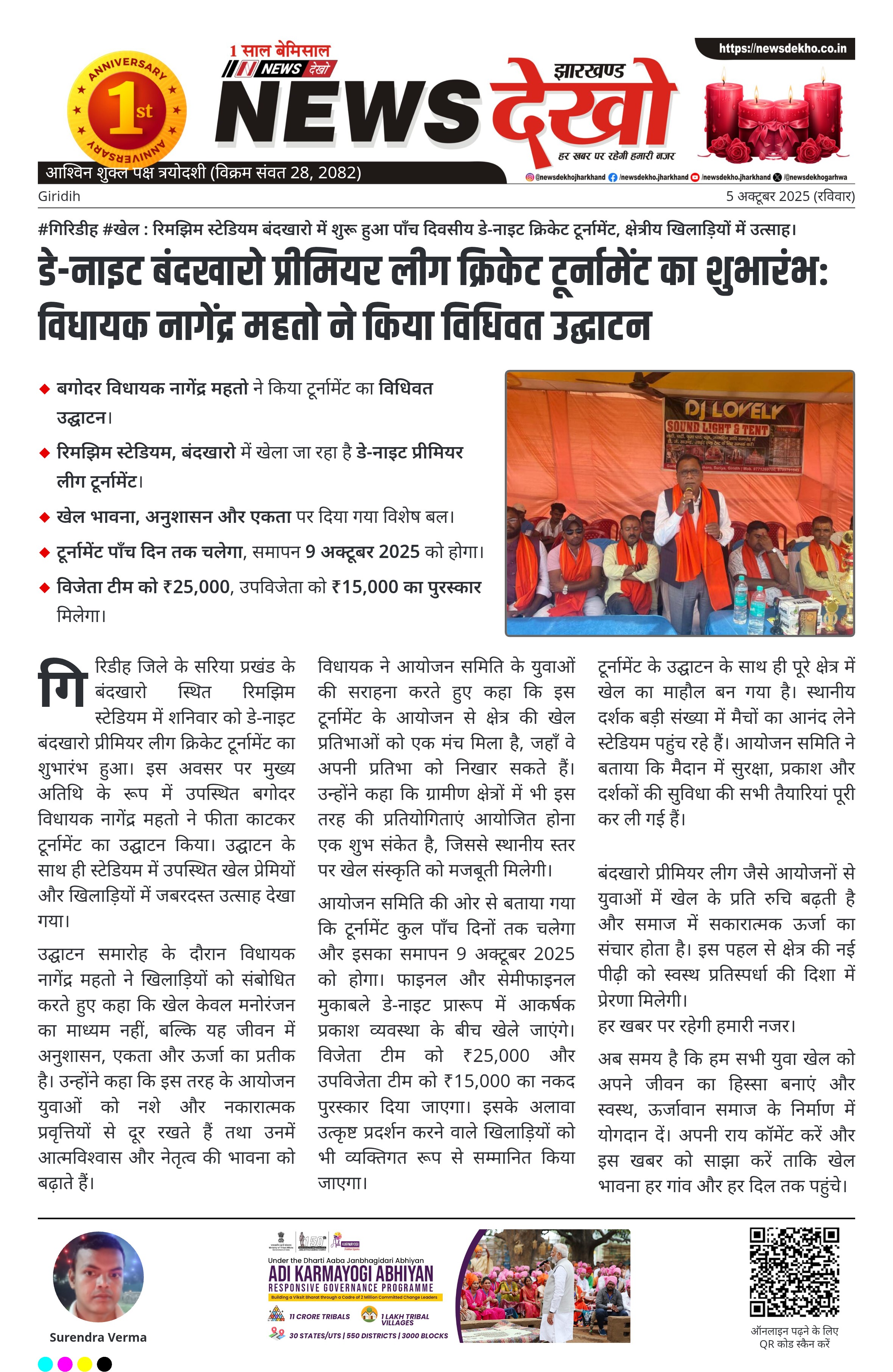 डे-नाइट बंदखारो प्रीमियर लीग क्रिकेट टूर्नामेंट का शुभारंभ: विधायक नागेंद्र महतो ने किया विधिवत उद्घाटन
