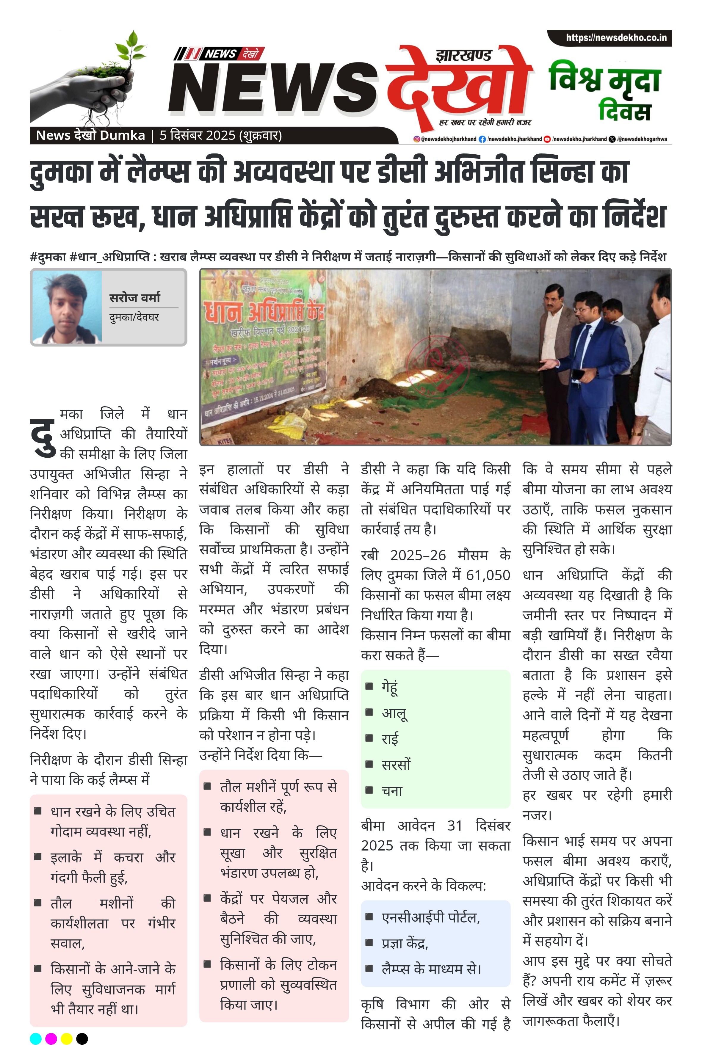 दुमका जिले में धान अधिप्राप्ति की तैयारियों की समीक्षा के लिए जिला उपायुक्त अभिजीत सिन्हा ने शनिवार को विभिन्न लैम्प्स का निरीक्षण किया। निरीक्षण के दौरान कई केंद्रों में साफ-सफाई, भंडारण और व्यवस्था की स्थिति बेहद खराब पाई गई। इस पर डीसी ने अधिकारियों से नाराज़गी जताते हुए पूछा कि क्या किसानों से खरीदे जाने वाले धान को ऐसे स्थानों पर रखा जाएगा। उन्होंने संबंधित पदाधिकारियों को तुरंत सुधारात्मक कार्रवाई करने के निर्देश दिए।