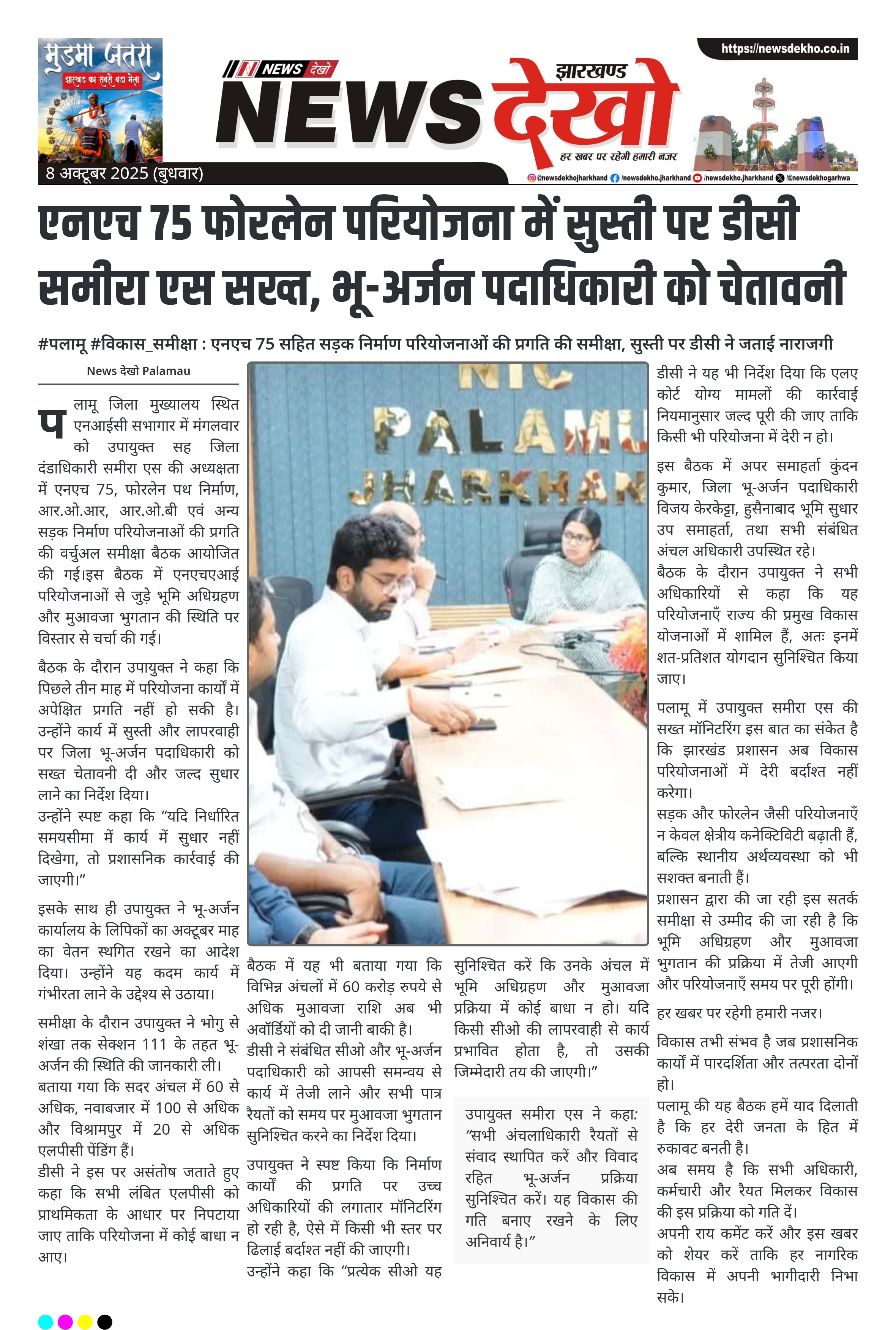 पलामू में उपायुक्त समीरा एस की सख्त मॉनिटरिंग इस बात का संकेत है कि झारखंड प्रशासन अब विकास परियोजनाओं में देरी बर्दाश्त नहीं करेगा।