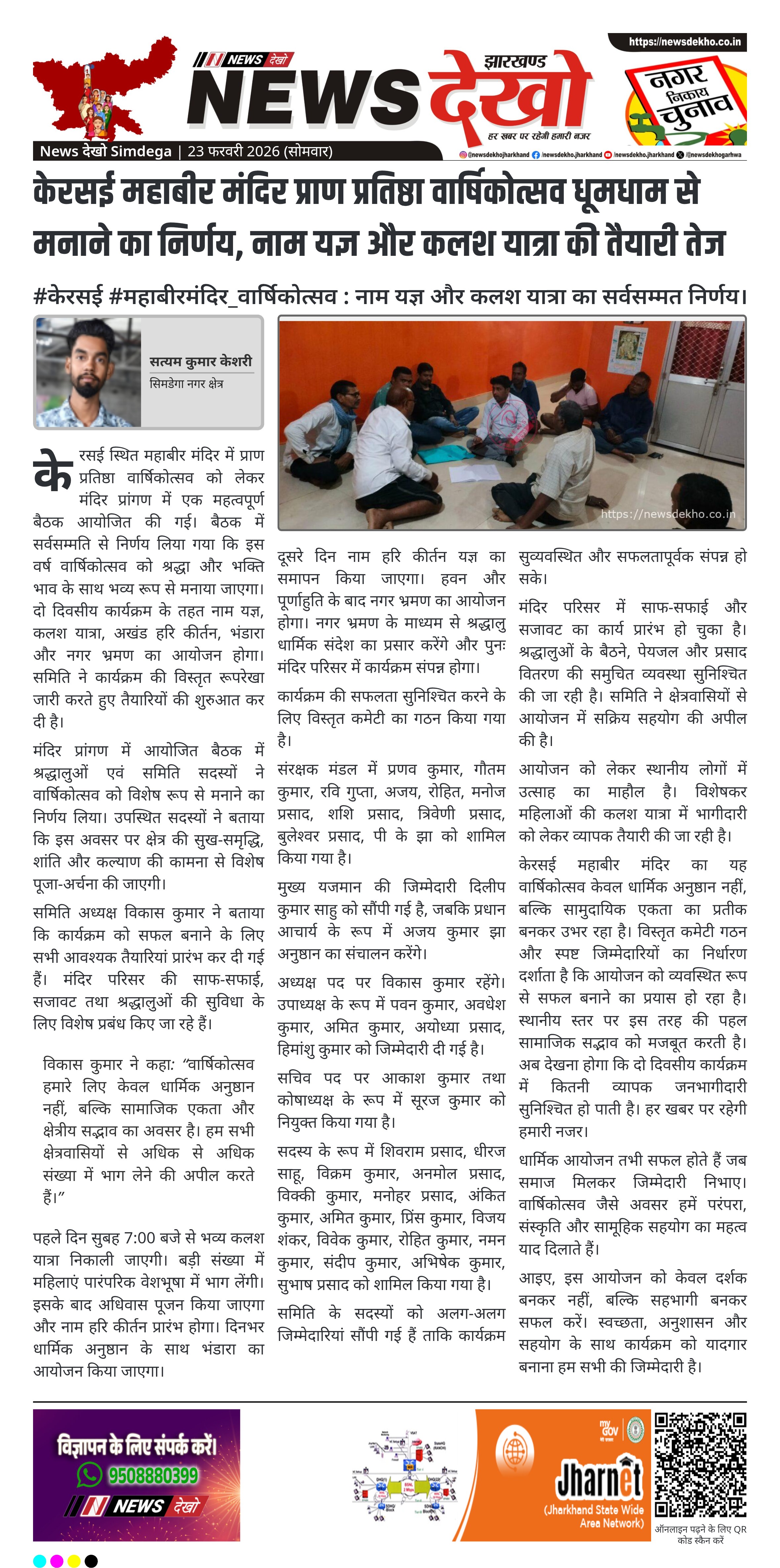 केरसई स्थित महाबीर मंदिर के प्राण प्रतिष्ठा वार्षिकोत्सव को इस वर्ष भव्य रूप से मनाने का निर्णय लिया गया है। मंदिर प्रांगण में आयोजित बैठक में नाम यज्ञ, कलश यात्रा, अखंड हरि कीर्तन और भंडारा के आयोजन का प्रस्ताव पारित हुआ। समिति ने 26 और 27 फरवरी 2026 को दो दिवसीय कार्यक्रम की रूपरेखा तय की है। आयोजन को लेकर कमेटी गठन और तैयारियां शुरू कर दी गई हैं।