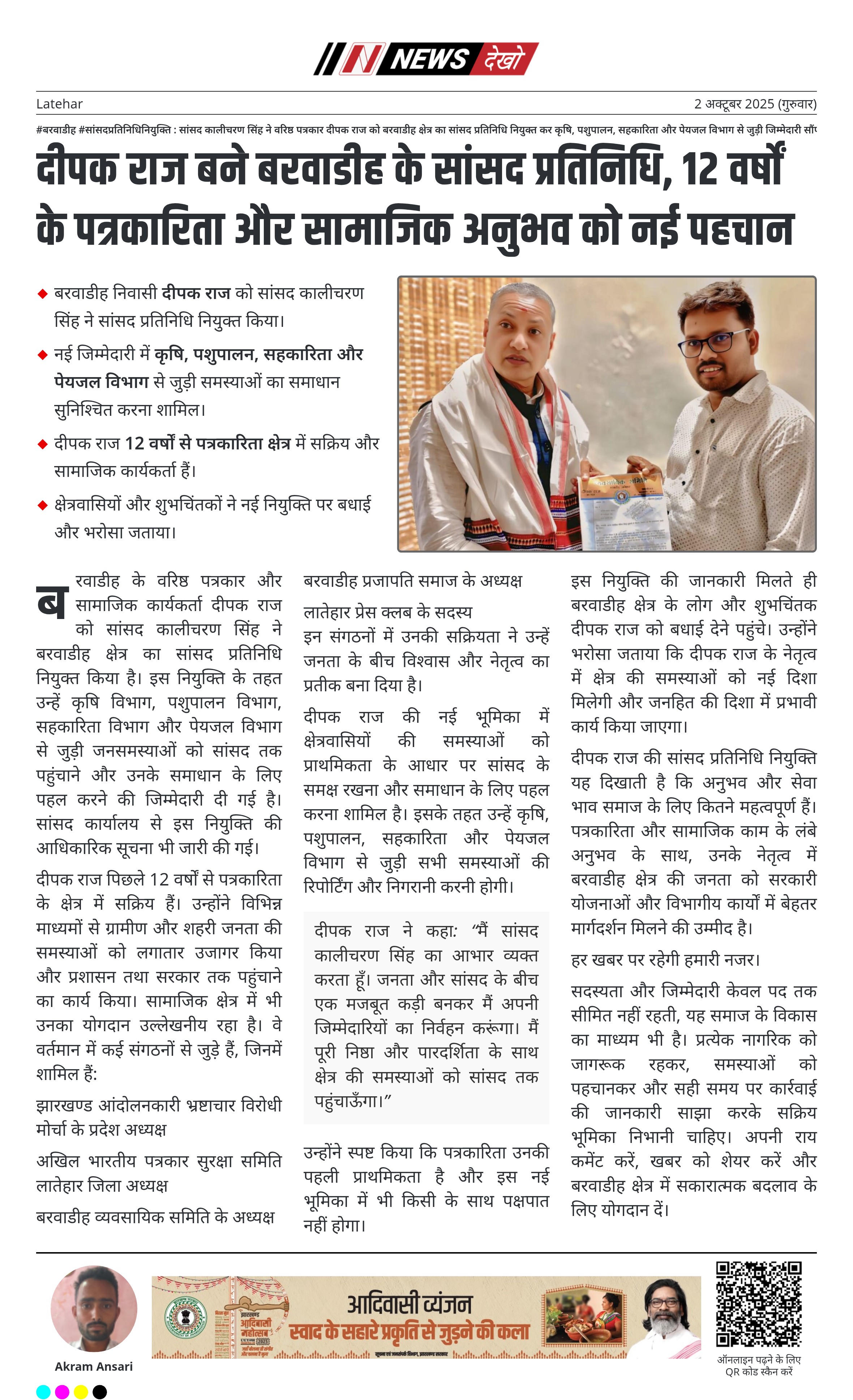 बरवाडीह के वरिष्ठ पत्रकार और सामाजिक कार्यकर्ता दीपक राज को सांसद कालीचरण सिंह ने बरवाडीह क्षेत्र का सांसद प्रतिनिधि नियुक्त किया है। इस नियुक्ति के तहत उन्हें कृषि विभाग, पशुपालन विभाग, सहकारिता विभाग और पेयजल विभाग से जुड़ी जनसमस्याओं को सांसद तक पहुंचाने और उनके समाधान के लिए पहल करने की जिम्मेदारी दी गई है। सांसद कार्यालय से इस नियुक्ति की आधिकारिक सूचना भी जारी की गई।
